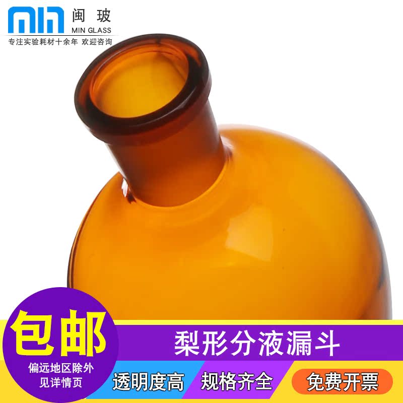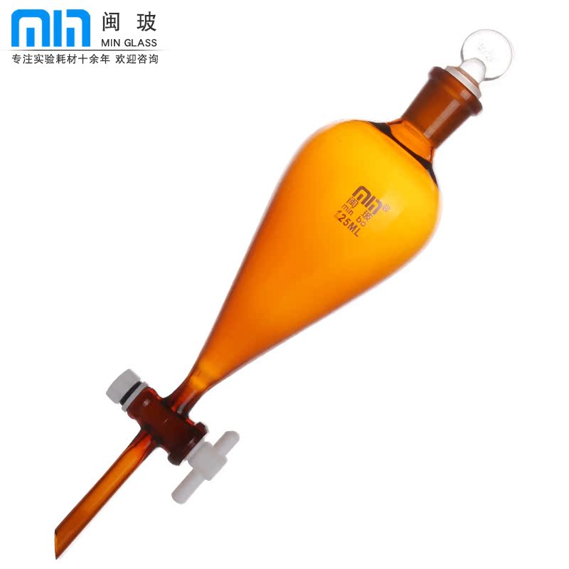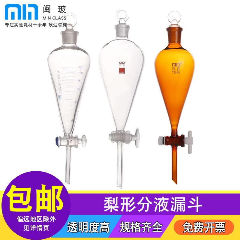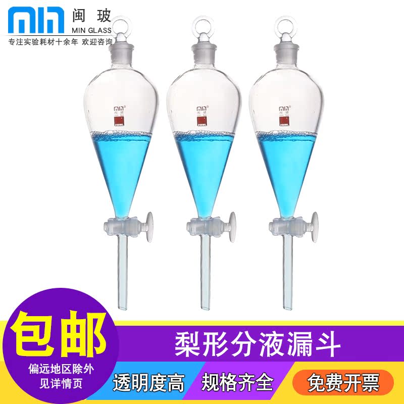 闽玻 实验室玻璃梨形分液漏斗聚四氟活塞分液漏斗玻璃活塞实验室油液分液漏斗60/125/250/500/1000/2000ml