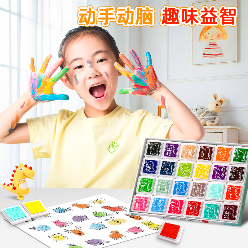 儿童彩色印泥印台手指画印泥手掌手指印泥盘幼儿园手指画印颜料安全绘画24色涂鸦可水洗小学生绘画工具印尼
