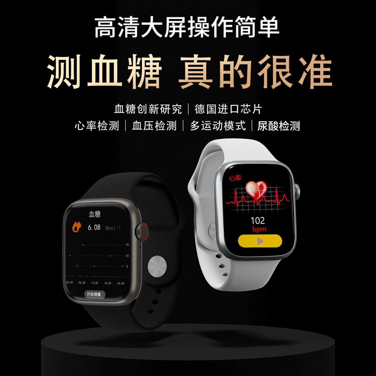 VRST高精度血糖测血压风险评估无创智能手表全天动态心率血氧心电健康监测量仪尿酸睡眠运动蓝牙通话手环老人
