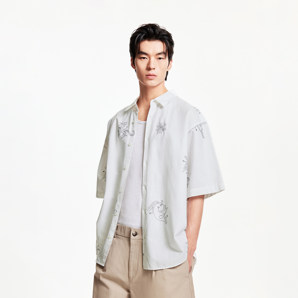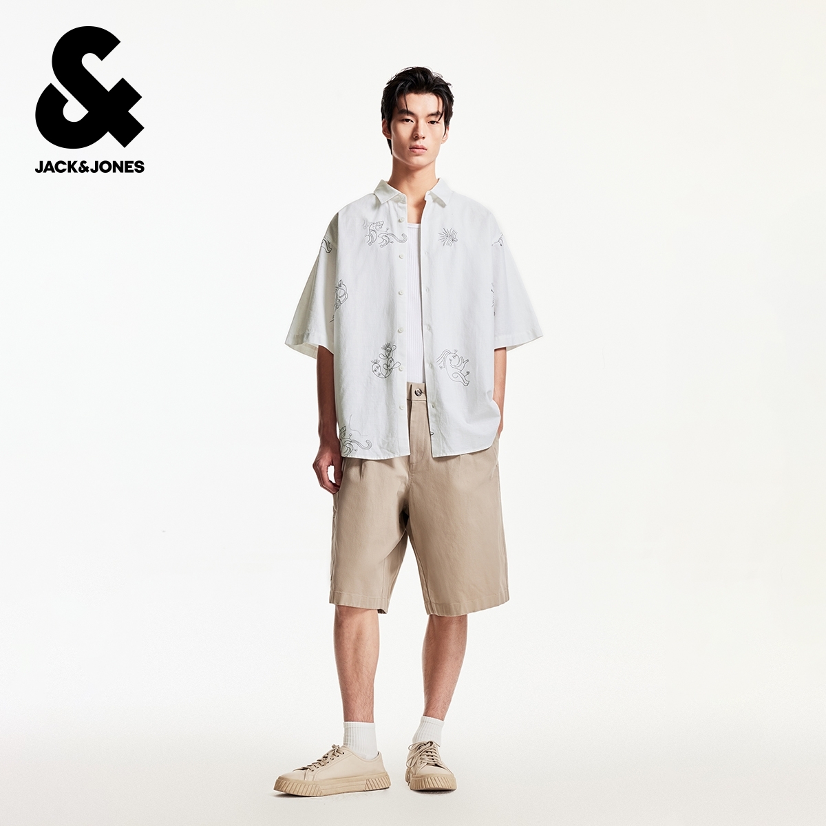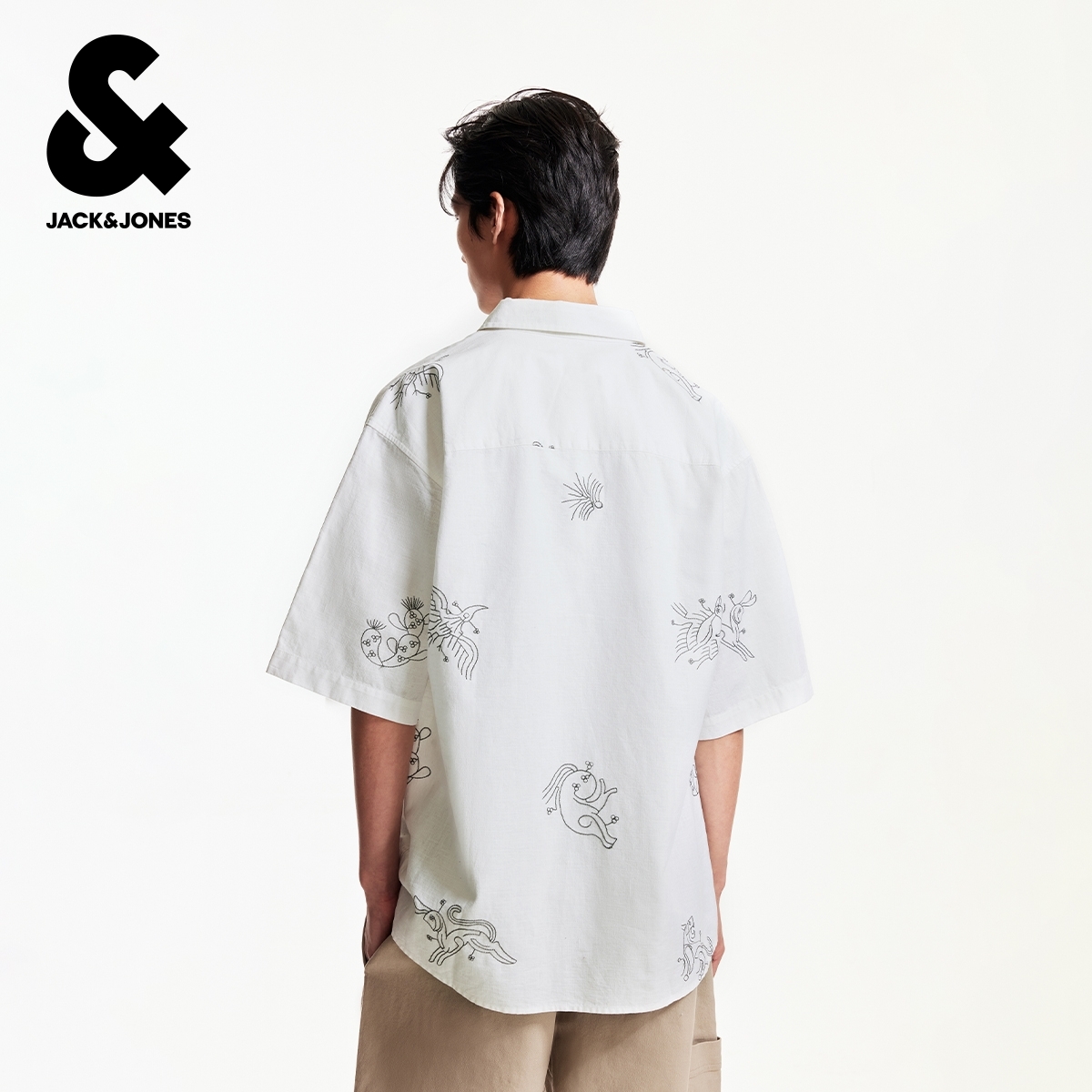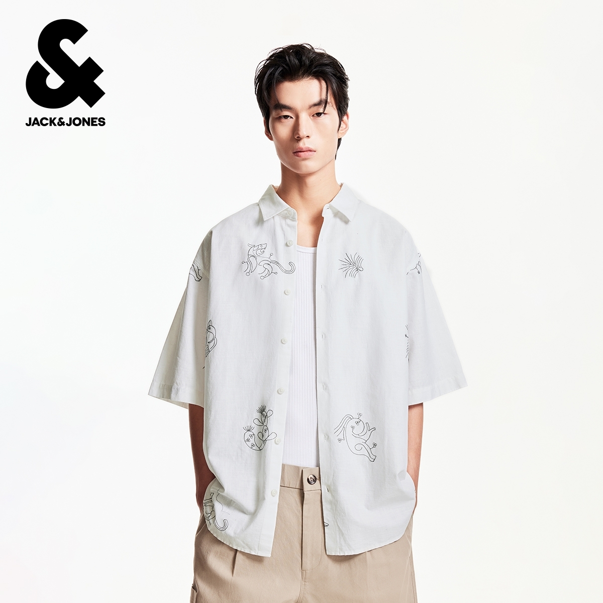 杰克琼斯夏季宽松版型翻领领口纽扣门襟衣身图案织花设计衬衫男装