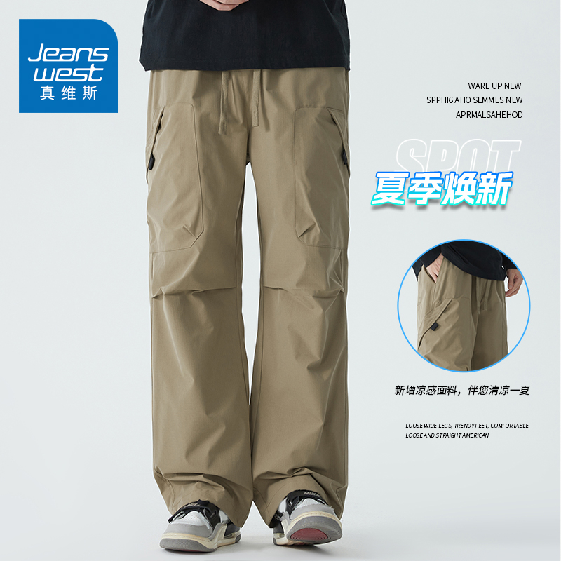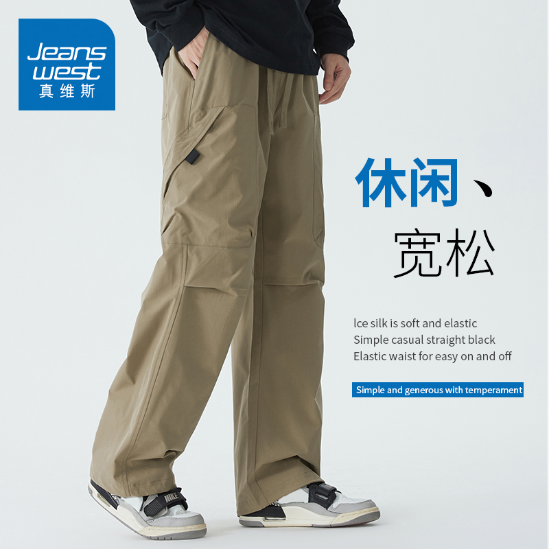 KZH真维斯机能工装裤男夏季新款宽松直筒裤卡其色潮流休闲长裤子