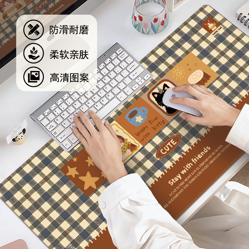 复古拼格小猫鼠标垫子超大号秋冬办公工位电脑键盘垫家用学习桌垫