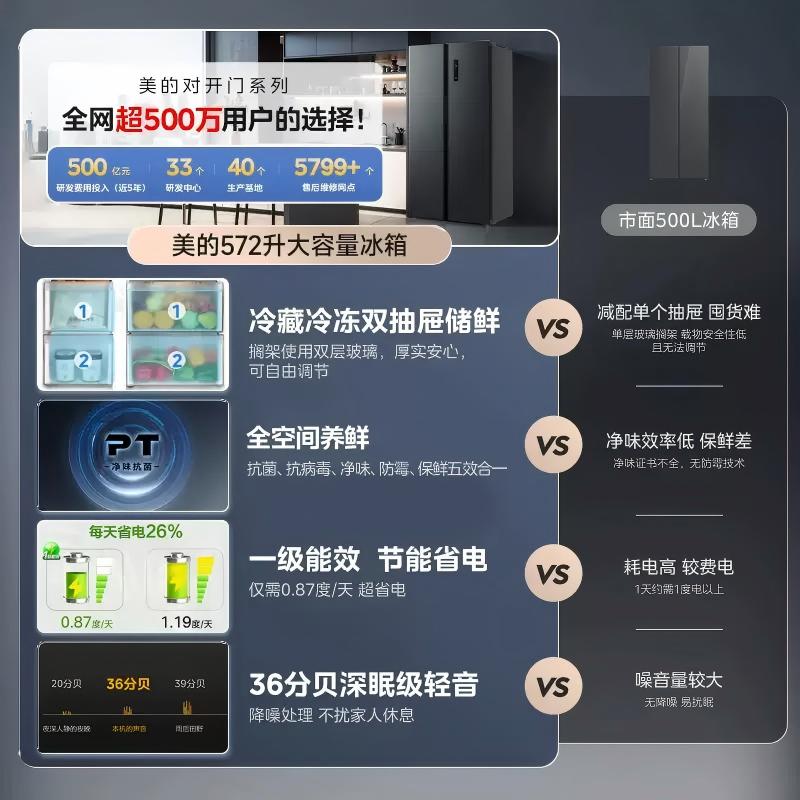 【大户型】美的572L嵌入对开门冰箱家用一级双变频PT净味风冷无霜