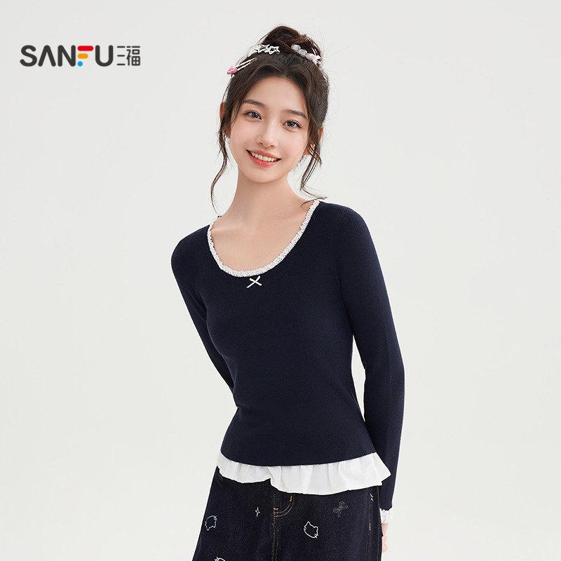 #三福打底毛衫2025冬季蕾丝花边蝴蝶结修身内搭上衣女装505400