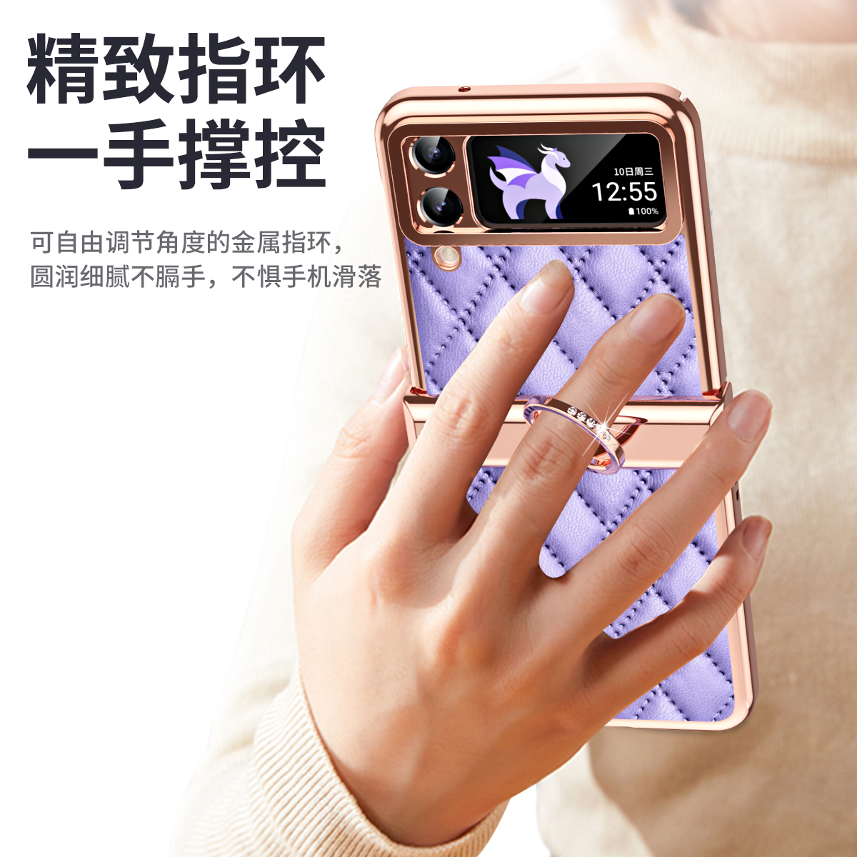 适用于 三星Flip3手机壳f7110小香风一体指环支架侧边铰链全包flip4菱形格子纹时尚个性超薄保护套高端皮质