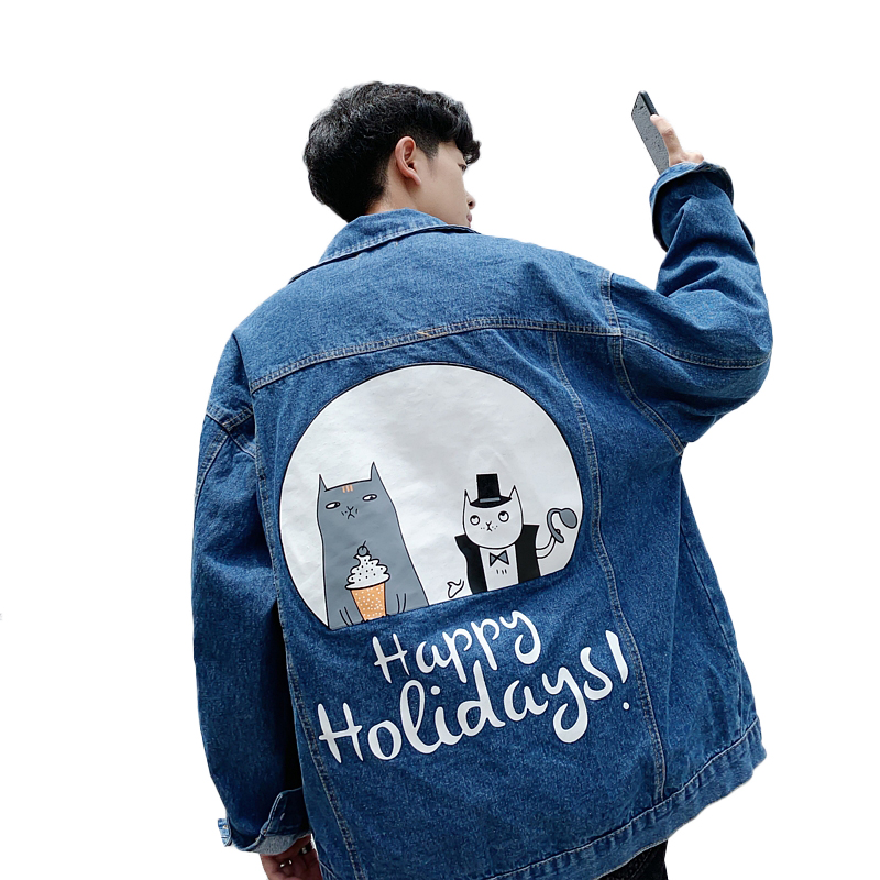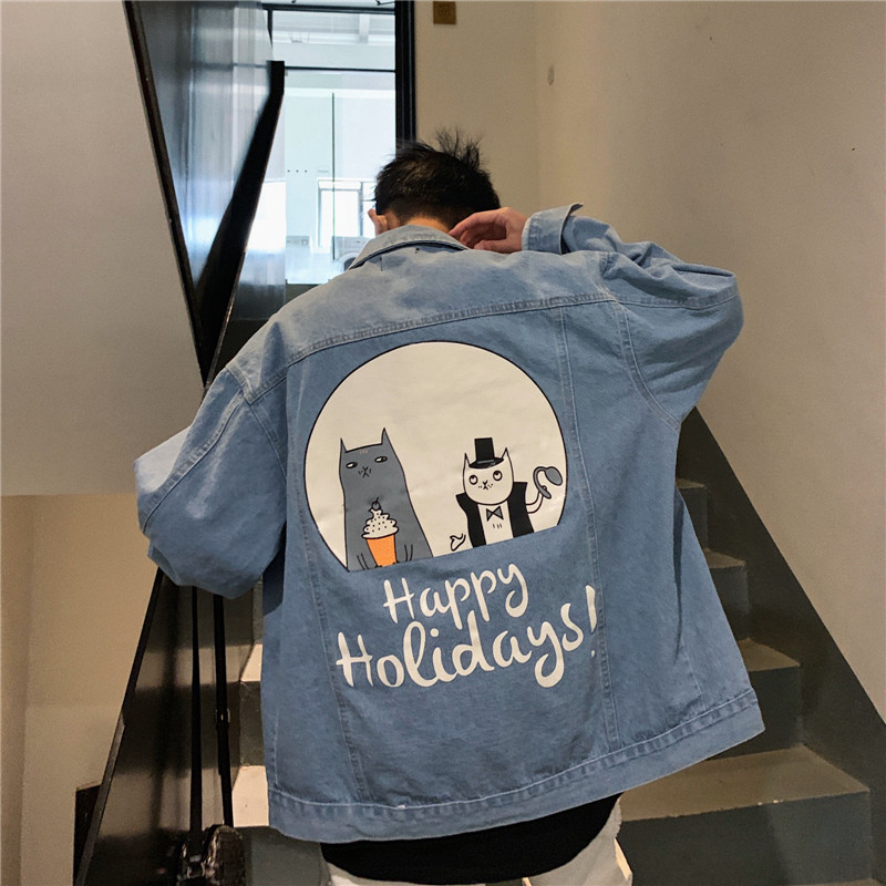原宿风日系牛仔外套男秋潮牌趣味印花工装夹克复古水洗青少年上衣
