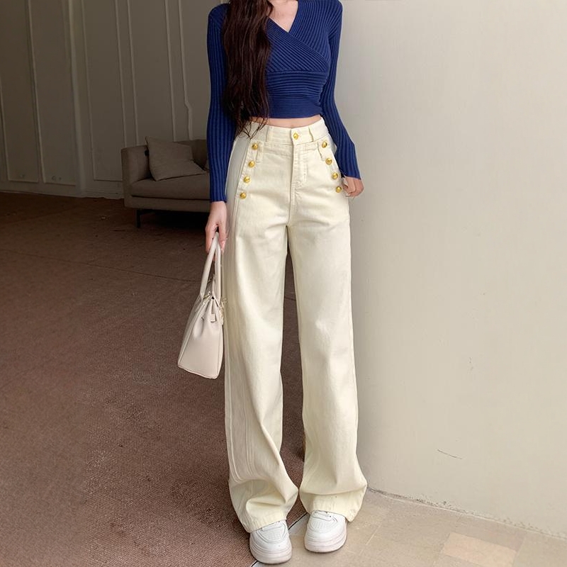 李李服饰米白色双扣丰胯微喇牛仔裤女2025秋季新款弹力显瘦长裤子