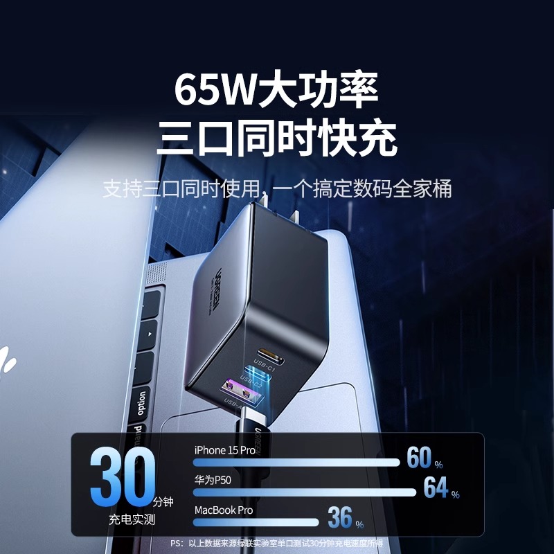 绿联65W氮化镓充电器PD快充头Gan适用苹果iPhone17pro华为小米macbook手机平板笔记本电脑双typec多口60W插头
