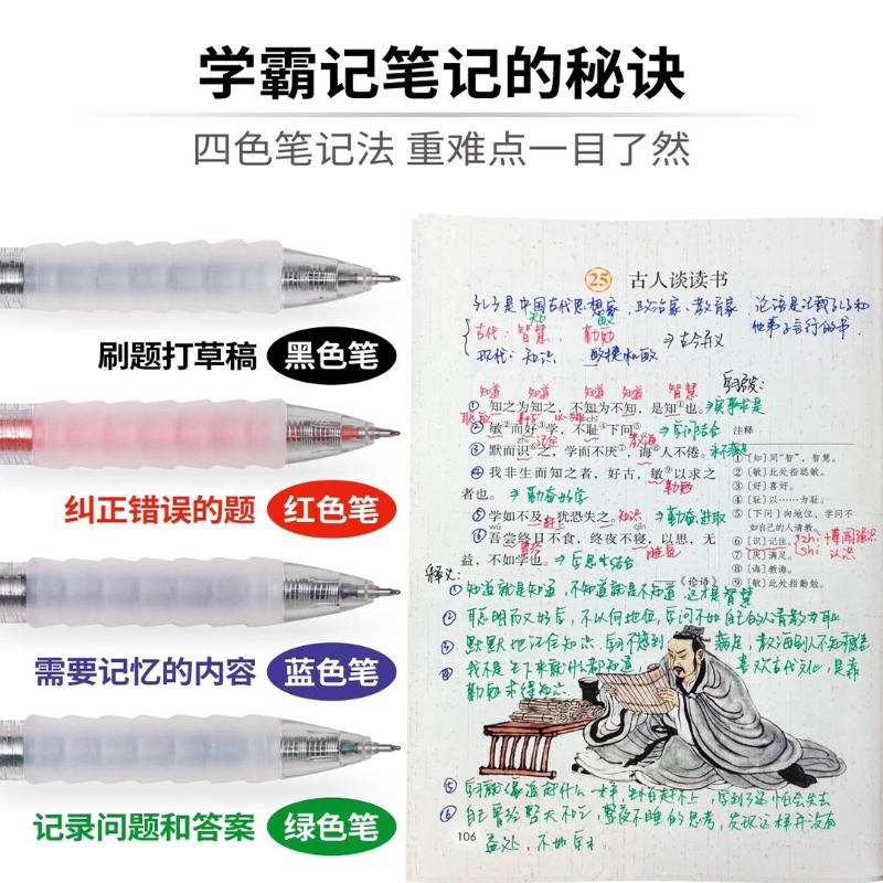 记忆吐司按动四色记忆笔高颜值学霸专用速干0.5彩色中性笔蓝色黑色红绿学生做笔记专用标记笔记号笔划重点