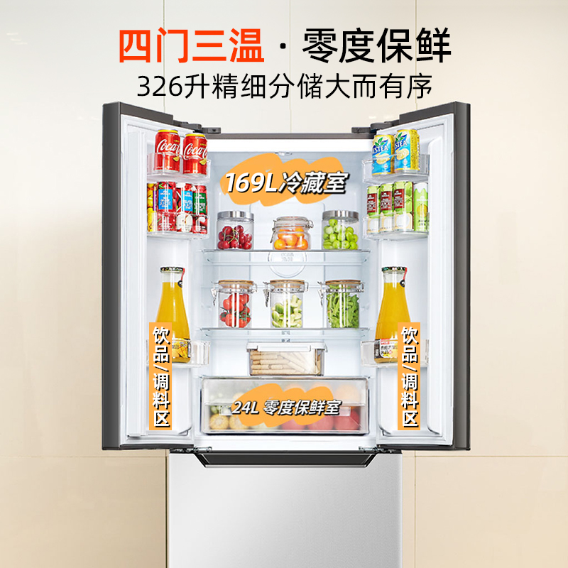 奥马冰箱326L家用一级能效法式四开门变频风冷无霜变频电冰箱超薄