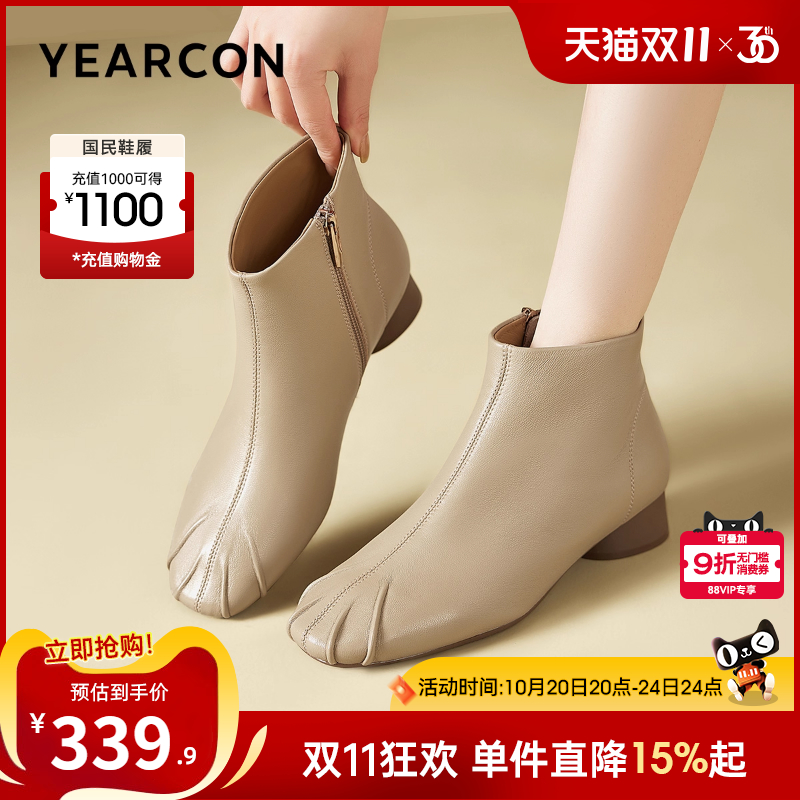 意尔康女鞋秋冬羊皮短靴粗跟单靴气质英伦显瘦复古及踝靴女士皮鞋