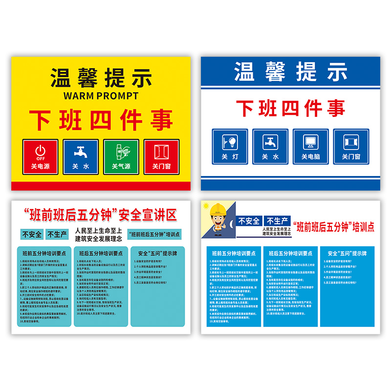 班前班后五分钟提示牌单位工厂公司安全五问不安全不生产宣传标语下班四件事关电关水关气关门窗警示标识标志