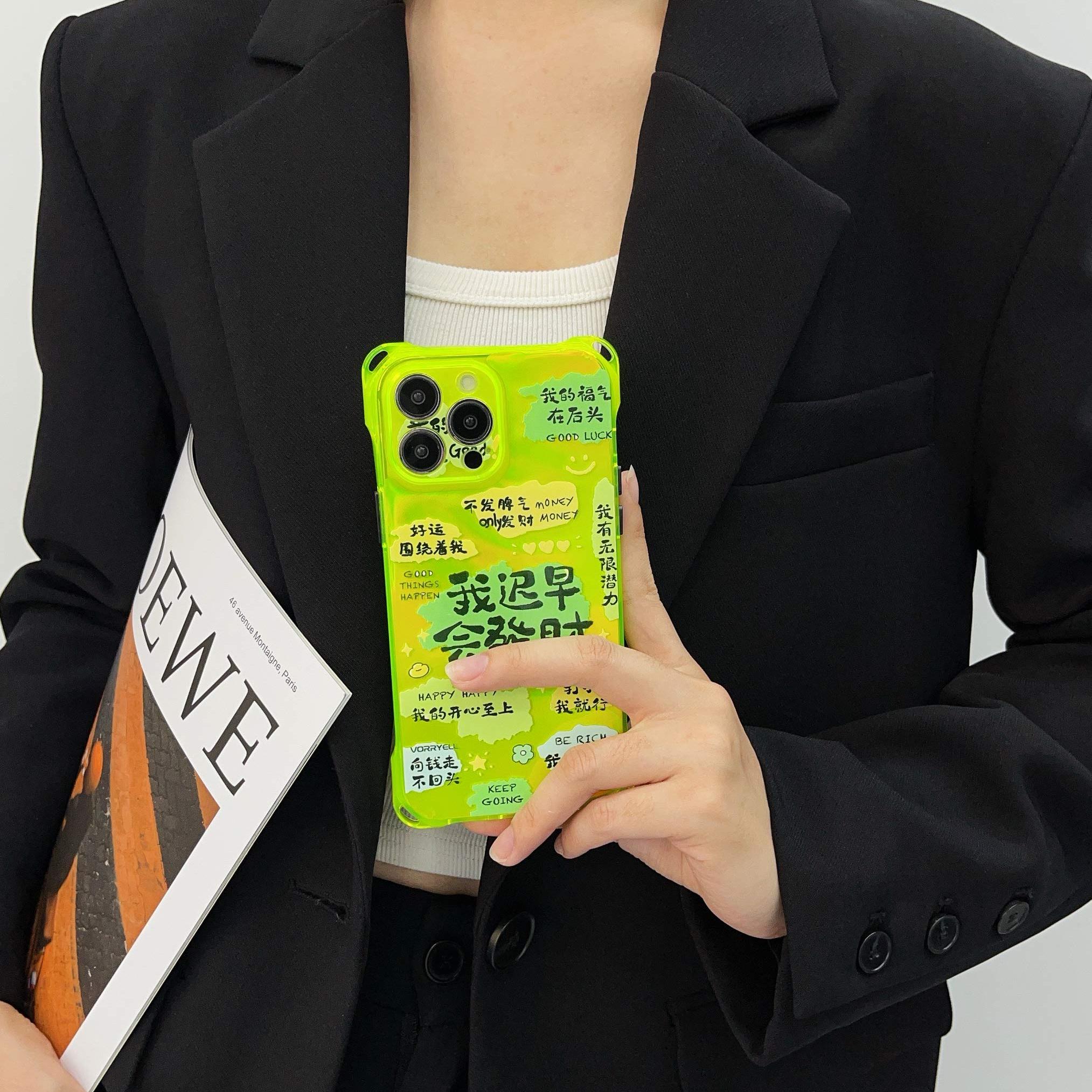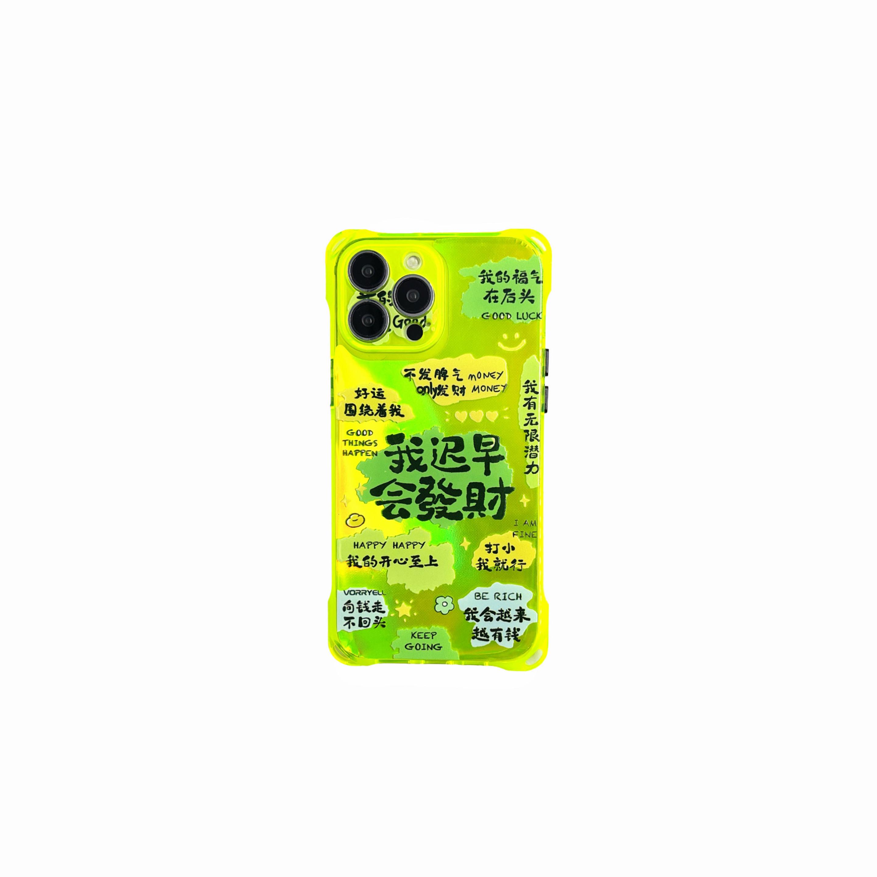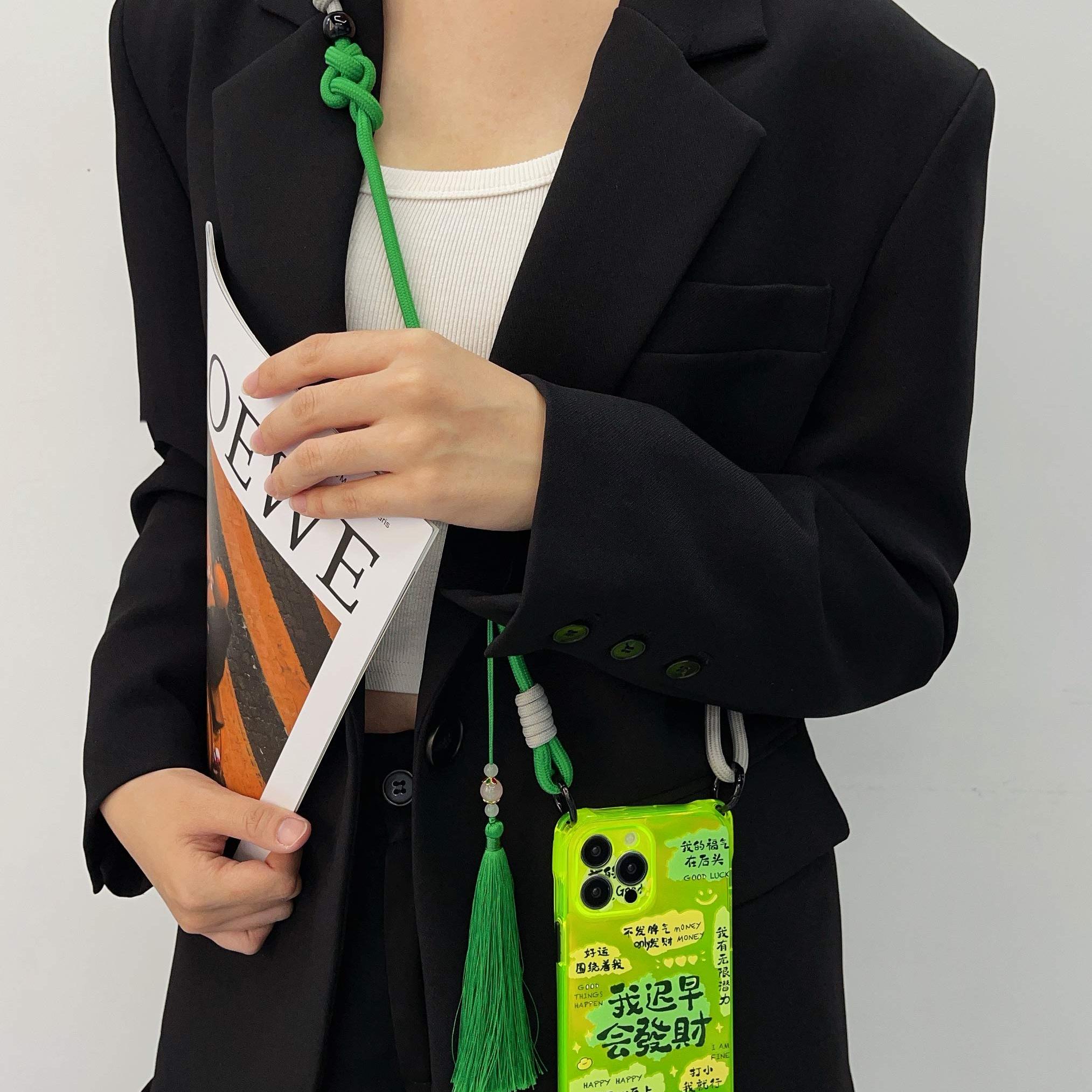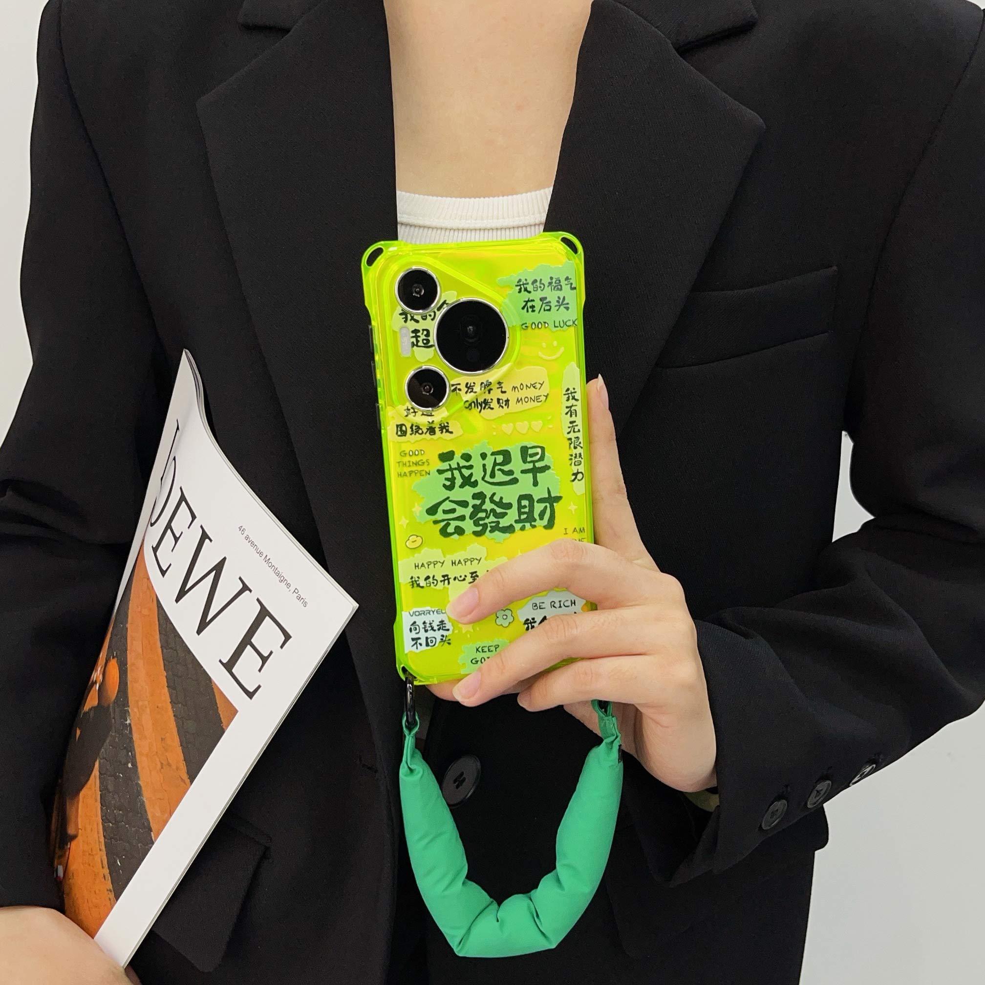 艺术个性【我迟早会发财】适用16Promax挂绳手机壳斜挎绳旅游防摔苹果15Pro荧光绿精孔全包mate60pro软硅胶壳