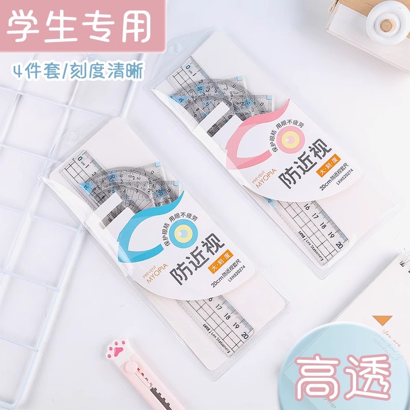小学生护眼4件套尺防近视设计含三角板波浪直尺加厚材质刻度清