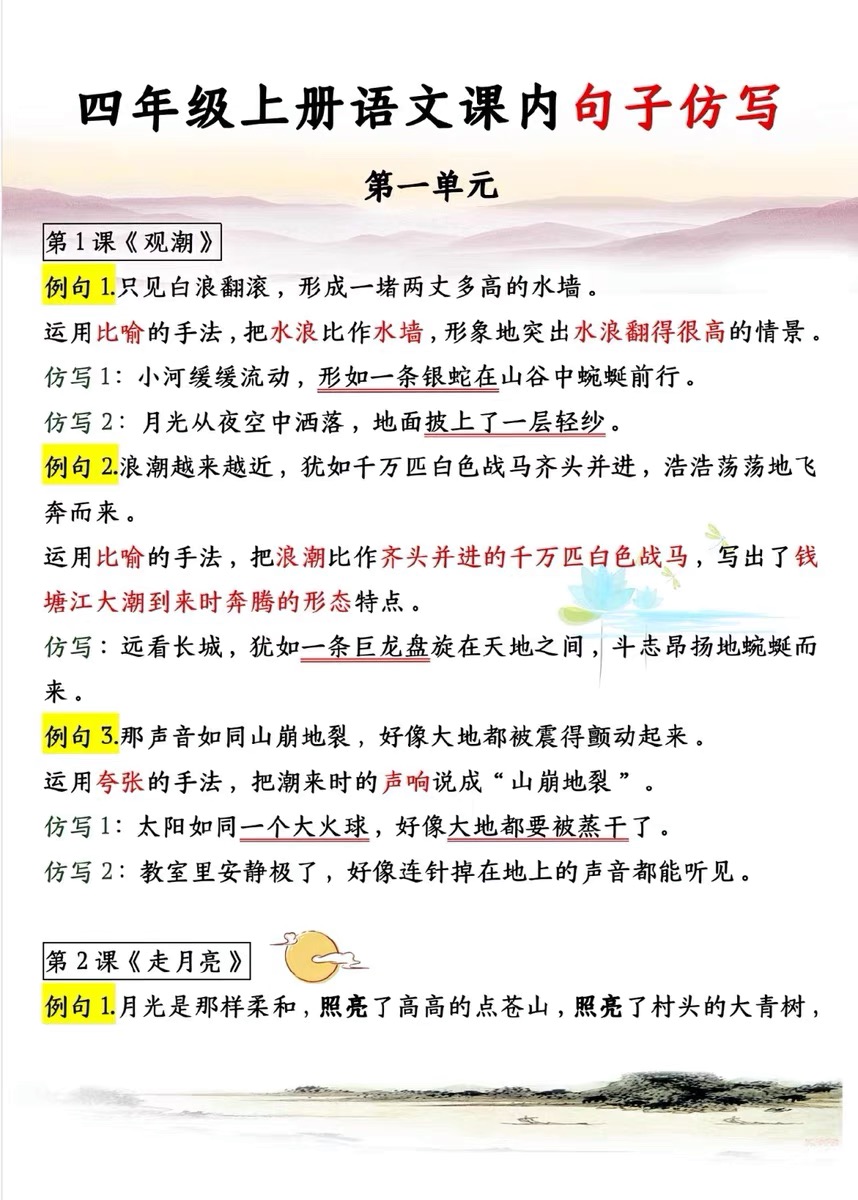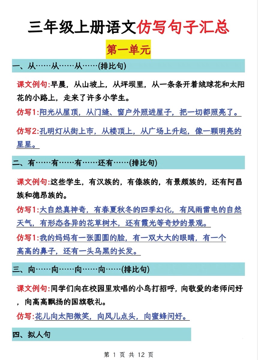 小学二年级上册三年级上册四年级上册语文重点句子仿写人教版句子仿写课本同步每课汇总二年级上册语文句子仿写单元汇总人教版每课