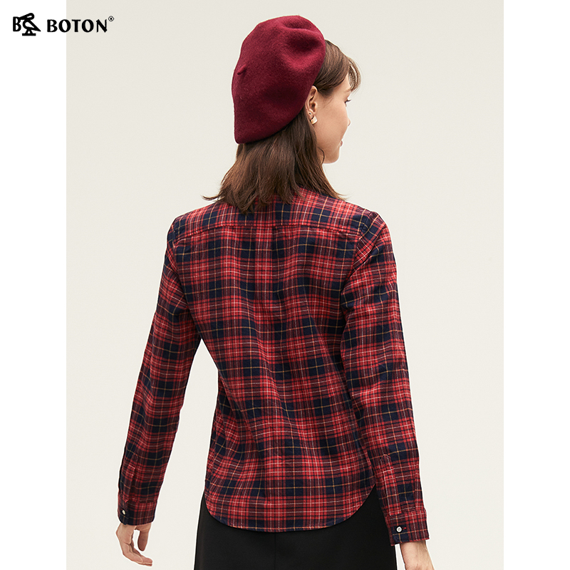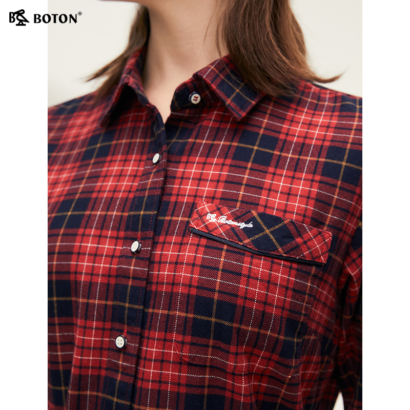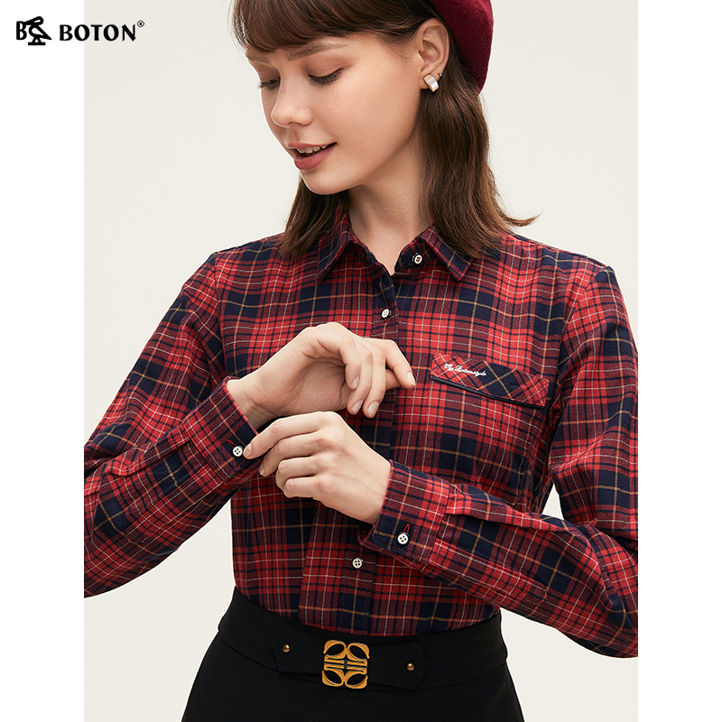 波顿2025秋季新款红蓝色长袖格子衬衫女高端美式休闲大码英伦衬衣