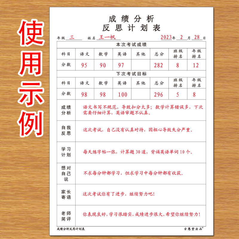 考试成绩分析反思计划表小初高学生语文数学英语等错题原因分析反思下次考试目标计划班级同学用打卡纸