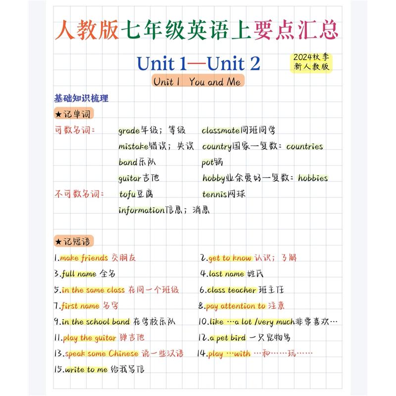 2025新人教版语文数学英语国一初一上册手写彩色核心笔记知识点总结梳理归纳电子版资料