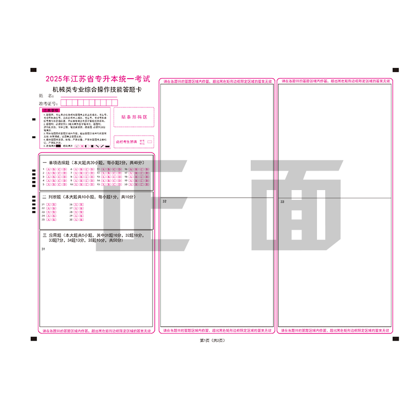 2025年江苏专转本机械大类专业综合技能模拟答题卡A3双面120克双胶纸 支持定制各类答题卡纸