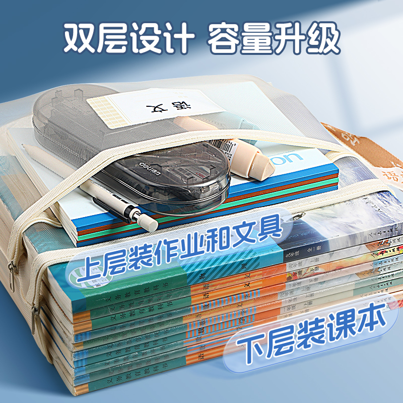 学科科目分类文件袋拉链式双层大容量小学生用资料书本课本分科书袋试卷收纳袋学生装卷子作业袋子A4透明网纱