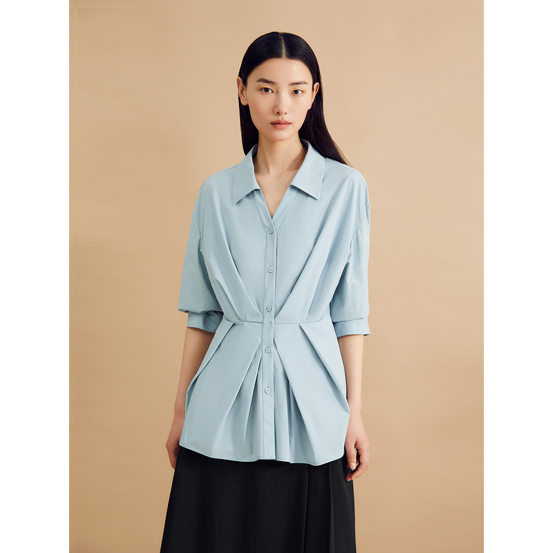 YINER音儿2024秋季新款法式不对称倒褶收腰海鸥领衬衫上衣