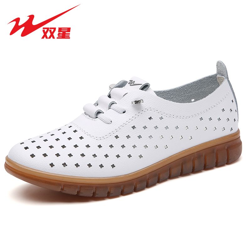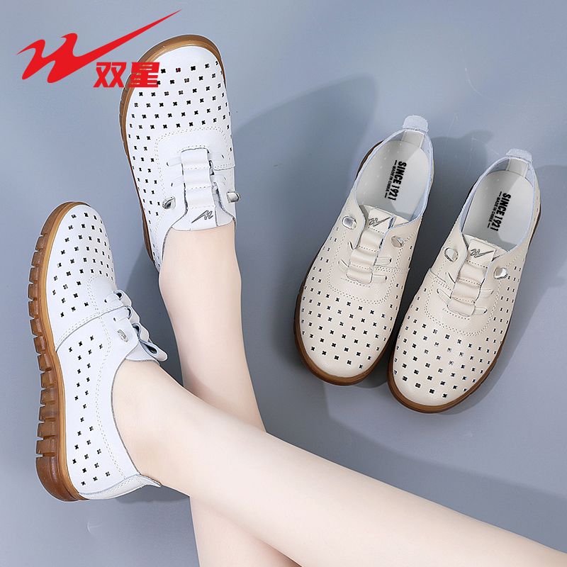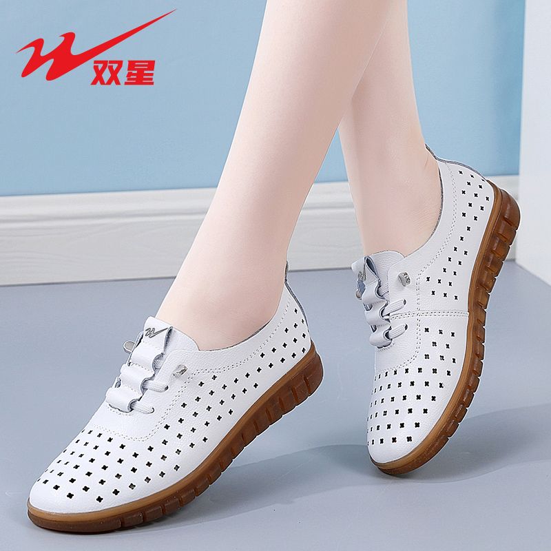 双星真皮女凉鞋透气镂空洞洞平底中年妈妈鞋软底小皮鞋女鞋