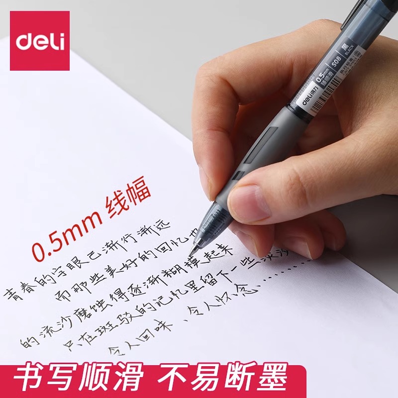 得力直液式走珠笔速干大容量直液笔0.5黑色中性笔学生用速干刷题笔水性笔直液笔圆珠笔商务办公简约风笔杆