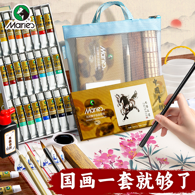 马利国画颜料初学者套装国画套装小学生中国画工具套装收纳水彩水墨画材料全套马利牌国画颜料旗舰店12色24色