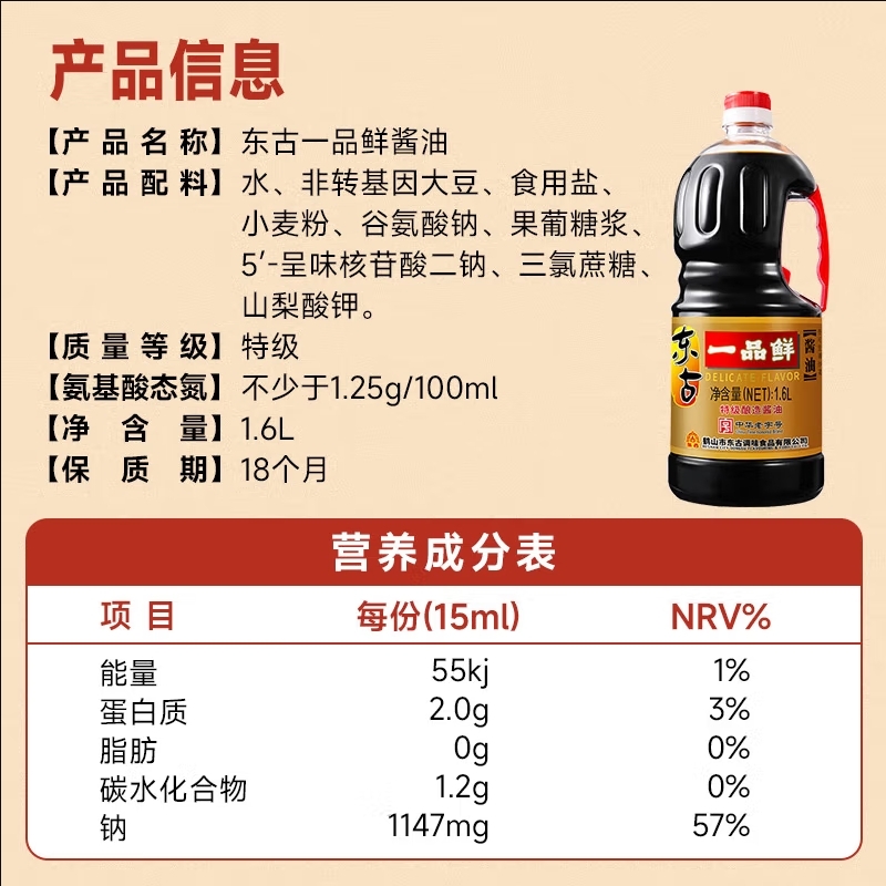 东古一品鲜酱油500ml/1.6L/5L多规格特级酿造生抽炒菜凉拌调味品