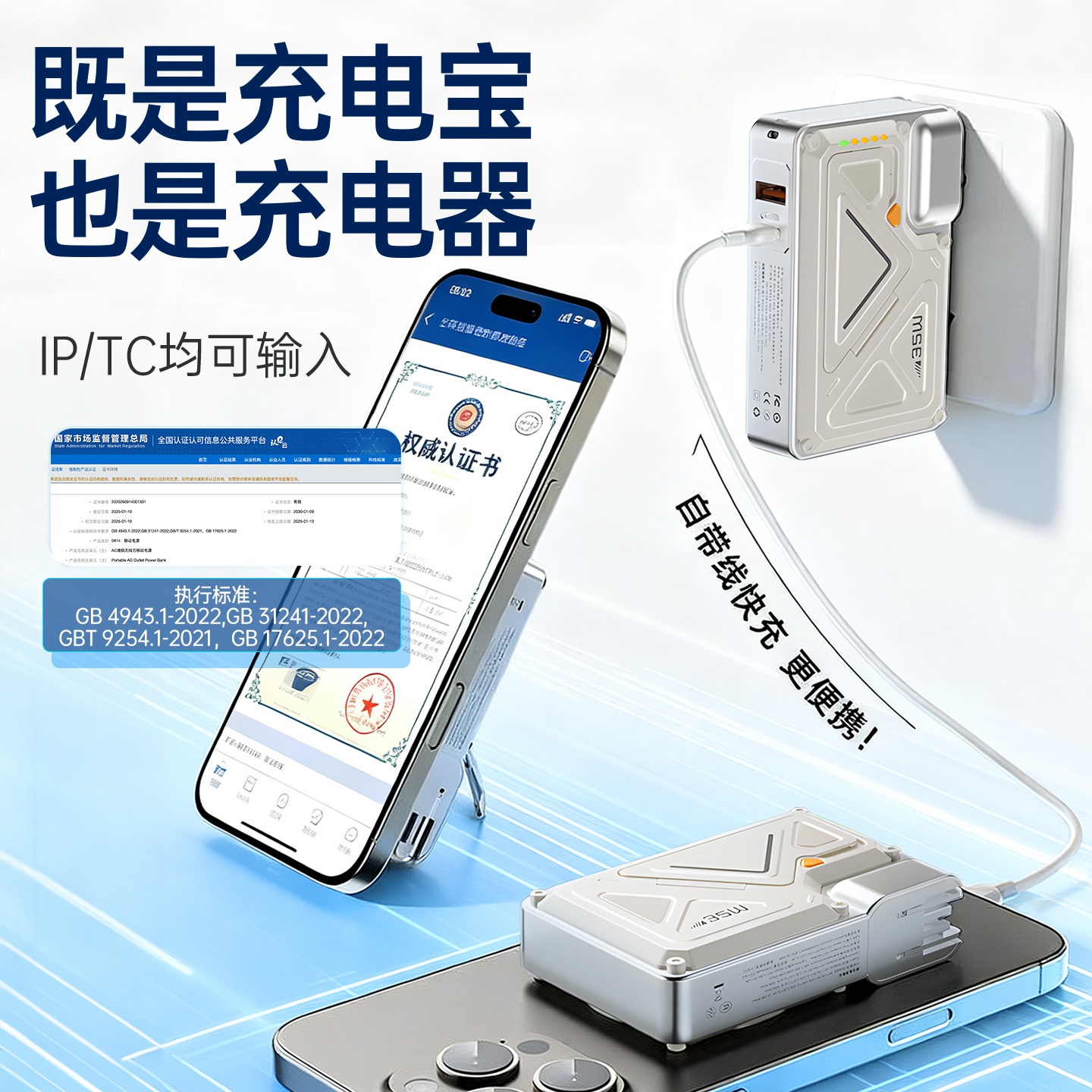 图拉斯小方块自带双线充电宝3C认证可上飞机2025新款快充45W大容量移动电源小巧标识便携带适用苹果/华为手机