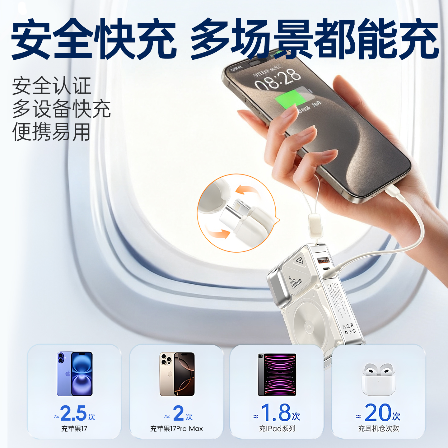图拉斯自带双线小云宝2025新款充电宝3C认证可上飞机适用苹果17超薄小巧便携快充移动电源官方国标大容量专用