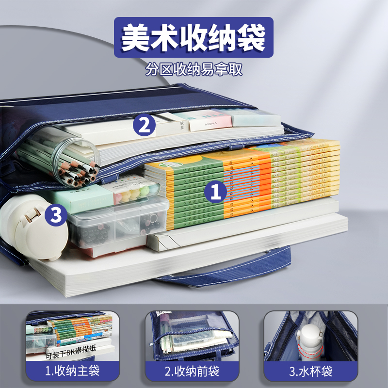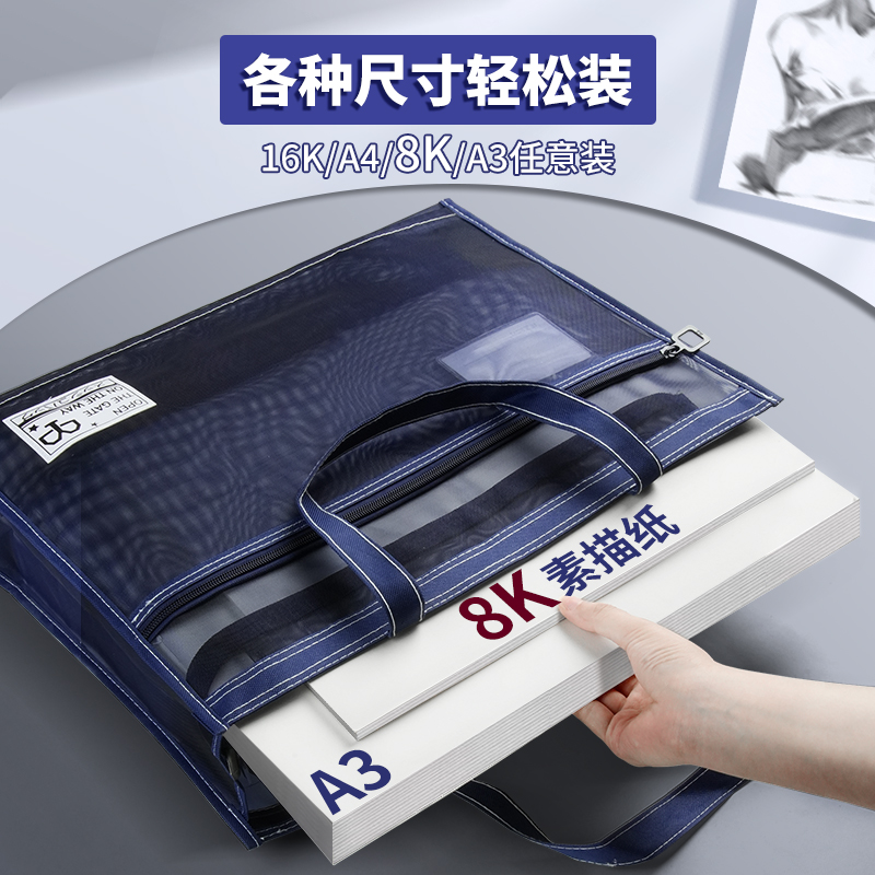 超大a3美术袋8开8k透明网纱文件袋拉链手提袋网格大容量儿童补习袋a4小学生素描画画收纳包分类袋手拎工具包