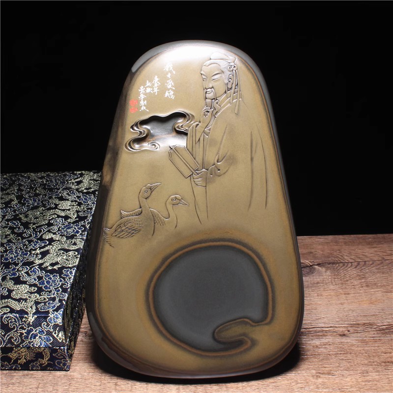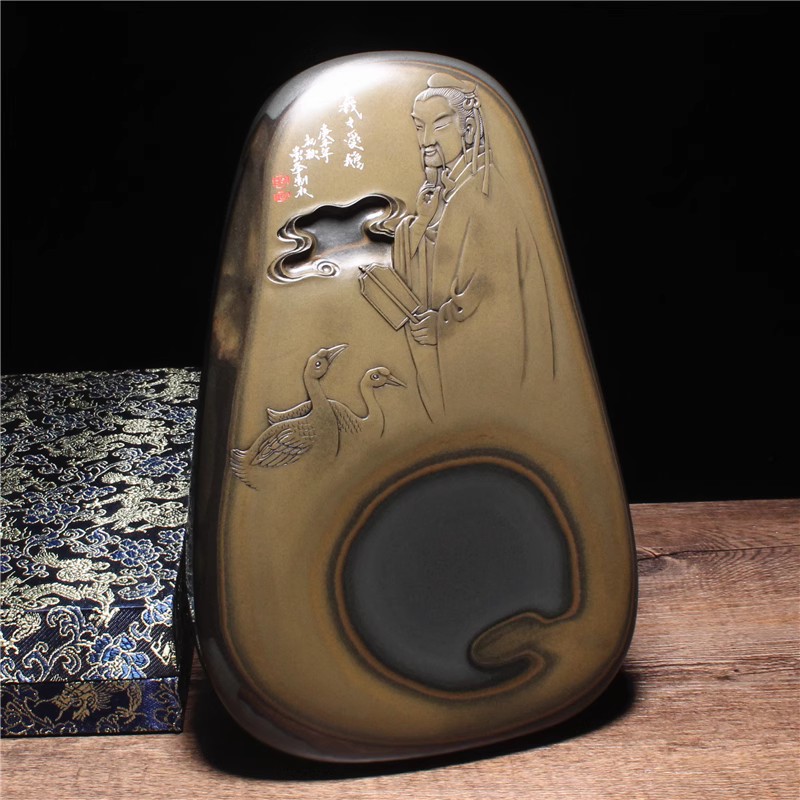手工歙砚名家胡尚峰精品砚台老坑金晕籽料秋山会友实用文房收藏品