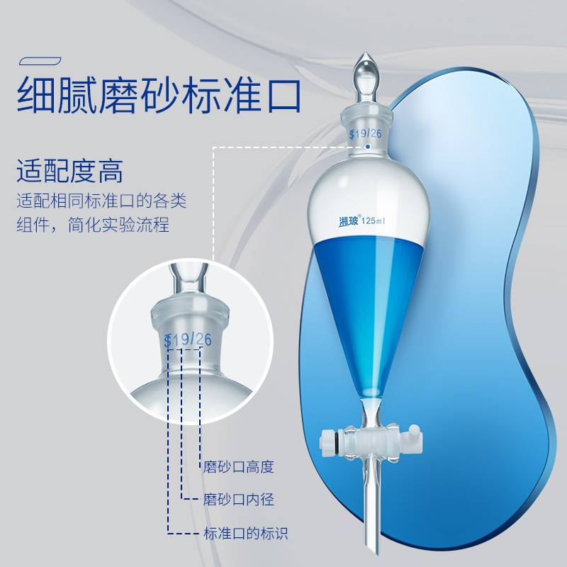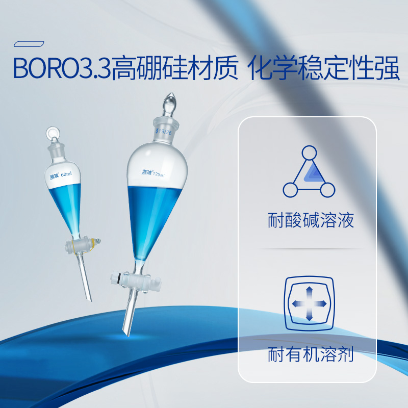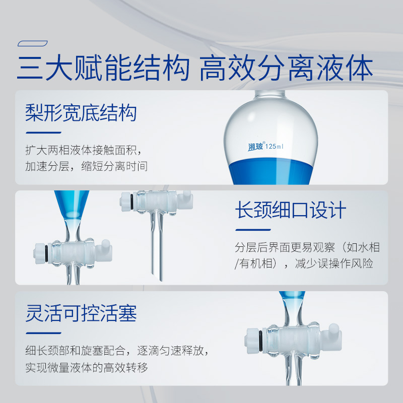 湘玻玻璃梨形分液漏斗实验室球形锥形分液漏斗高效分液玻璃活塞聚四氟锥形梨型60ml250ml毫升油液分离分液器