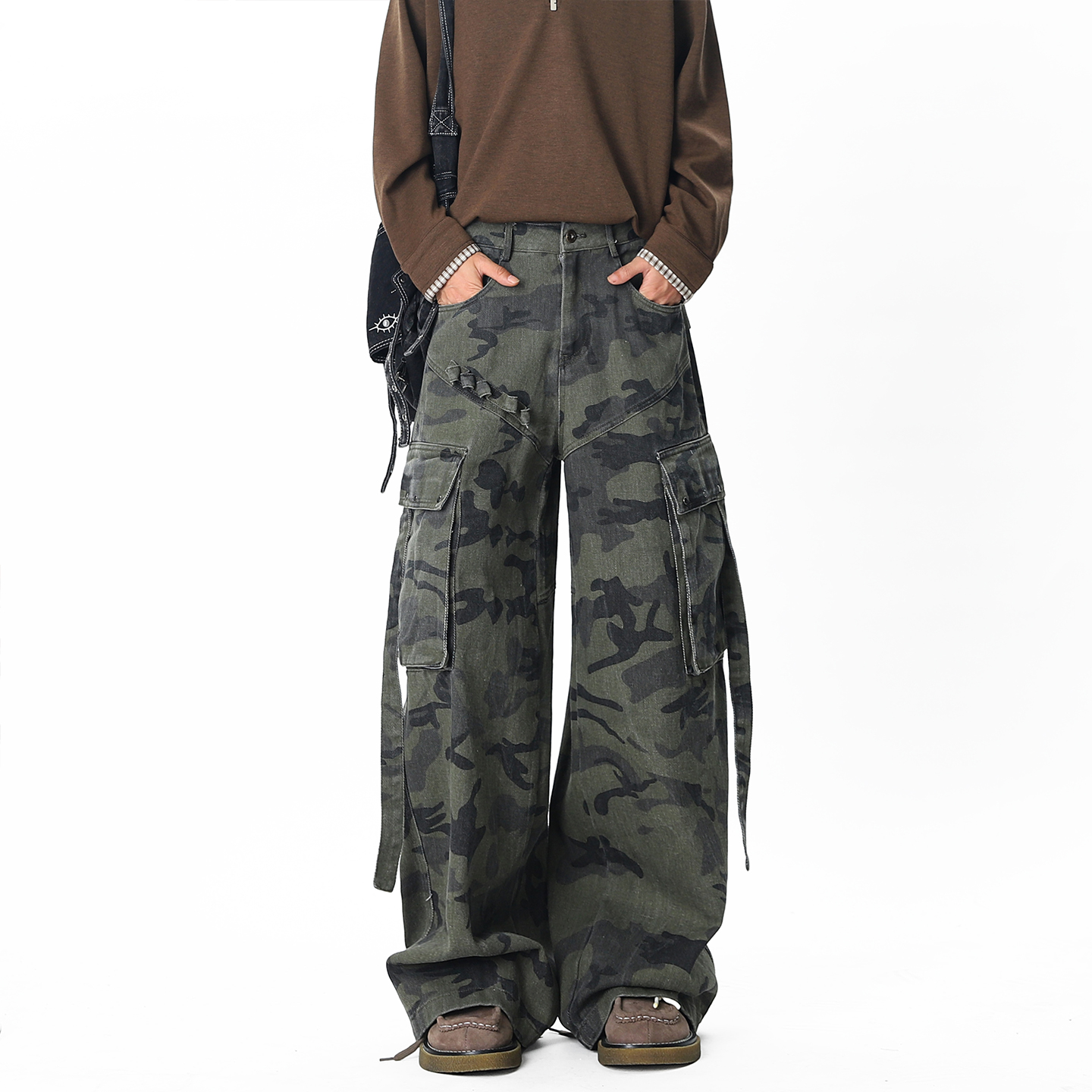 美式水洗迷彩工装裤子男秋季潮牌复古宽松直筒多口袋飘带阔腿长裤
