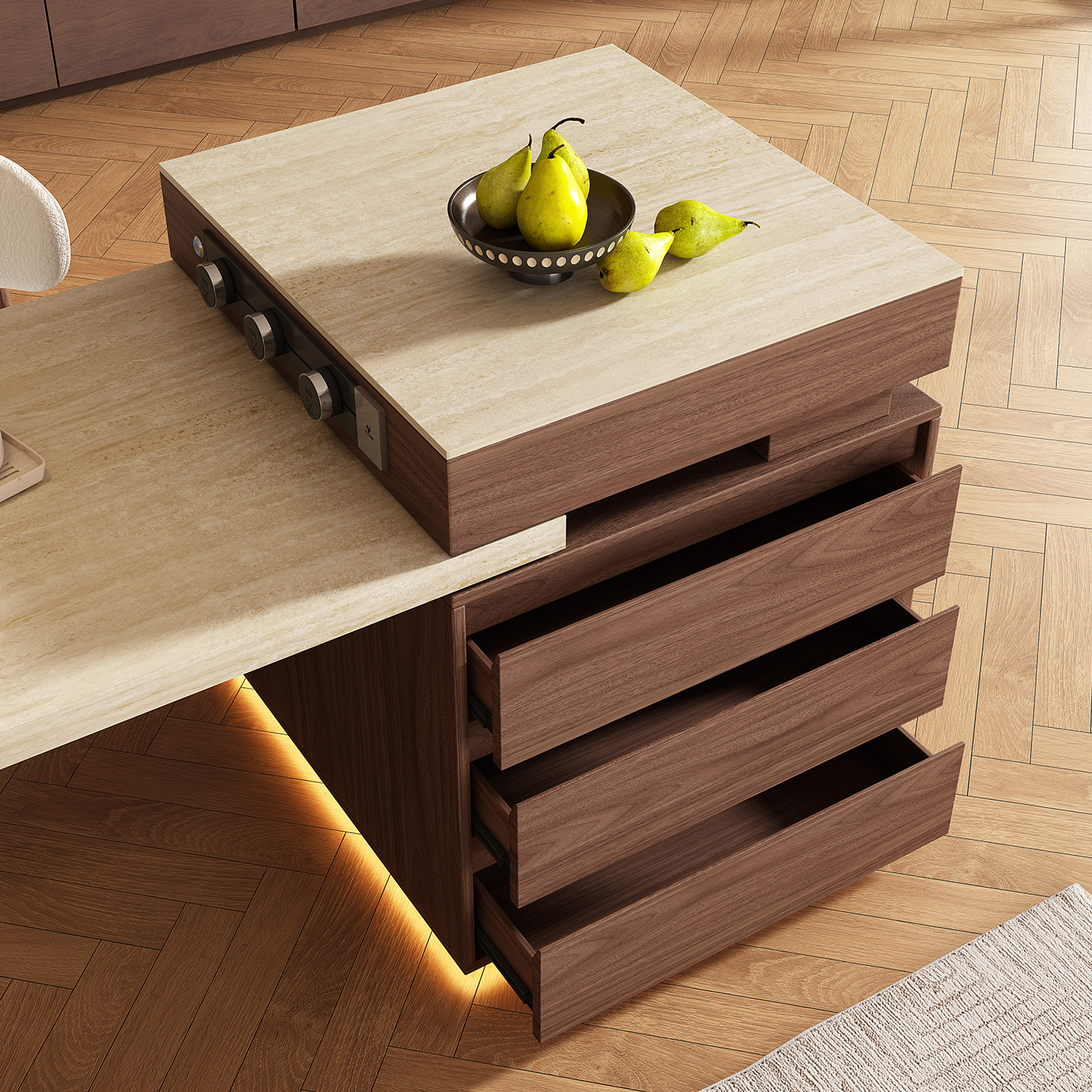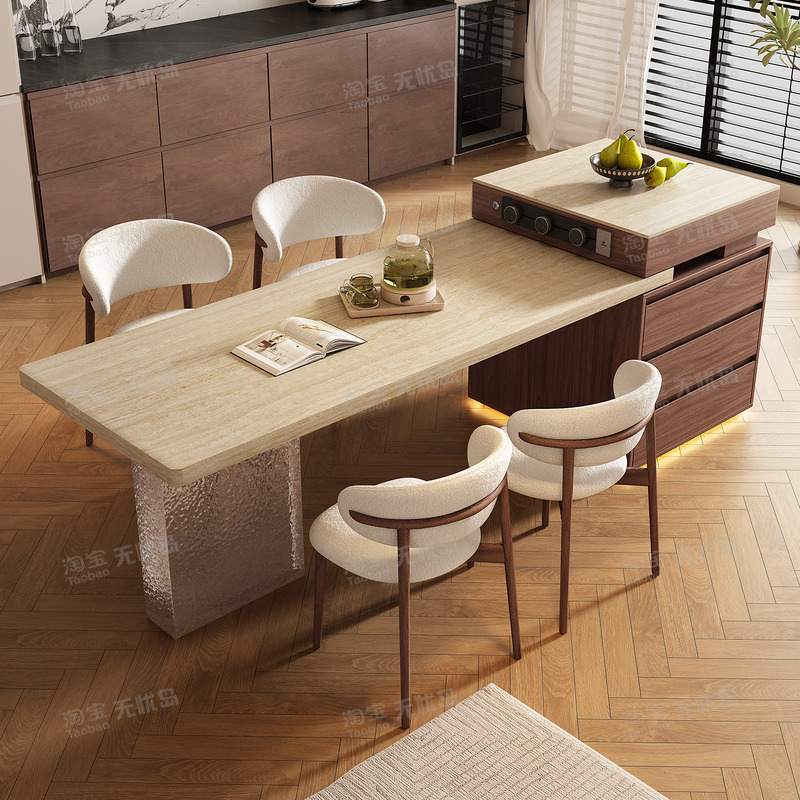 无忧岛中古风实木岛台餐桌一体家用可伸缩洞石岩板中导台餐厅倒台