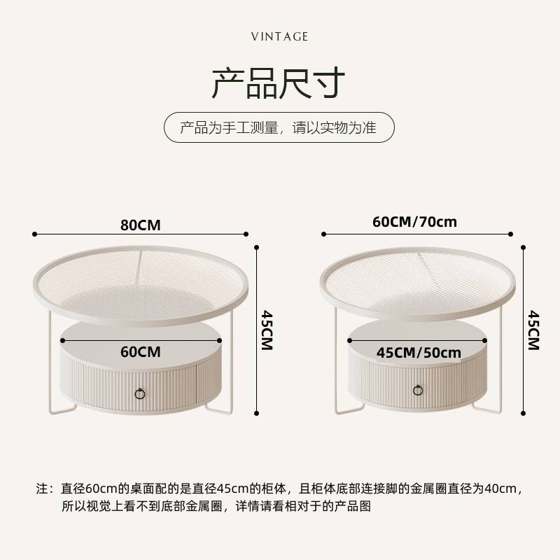 奶油风岩板圆形钢化玻璃茶几家用客厅简约设计款带收纳空间小户型