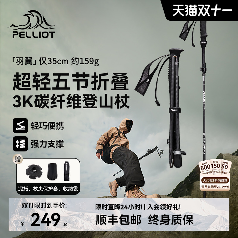 【羽翼】伯希和户外登山杖男碳纤维超轻折叠专业装备徒步手杖女款