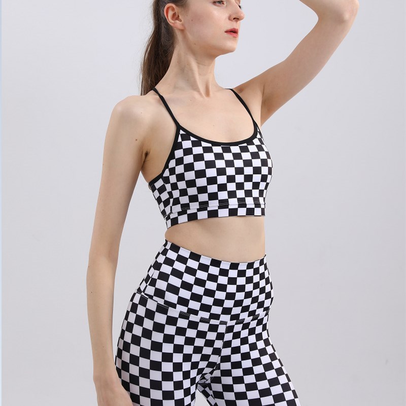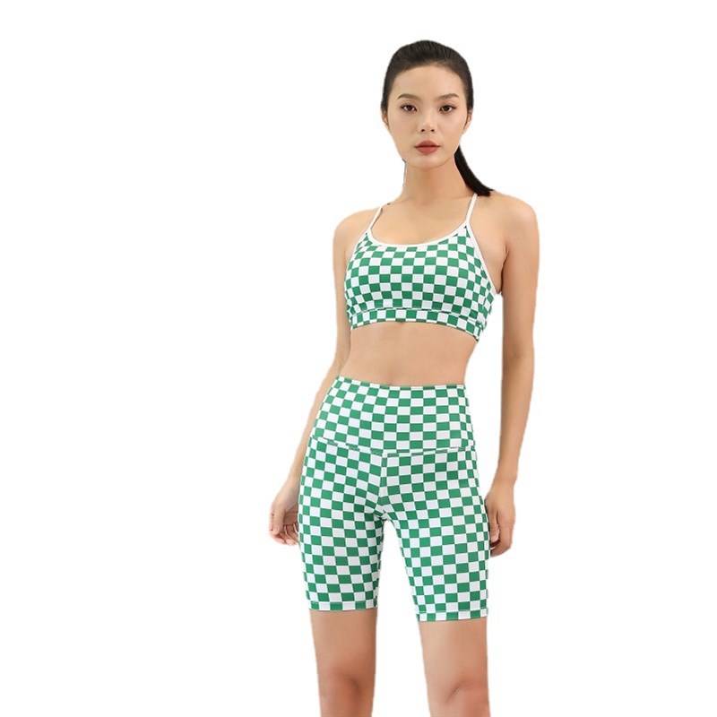 欧美棋盘格瑜伽服套装美背心吊带胸垫运动文胸内衣紧健身五分中裤
