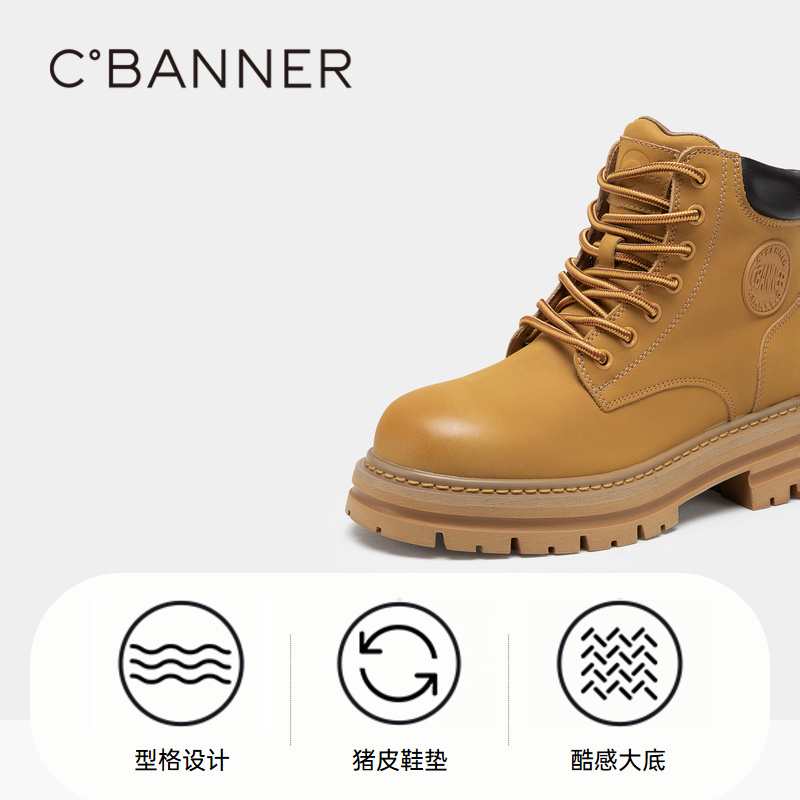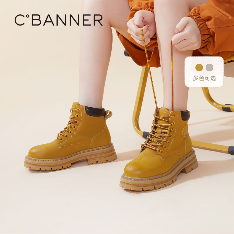 千百度女鞋秋冬新款马丁靴短靴大黄靴厚底复古工装踢不烂真皮