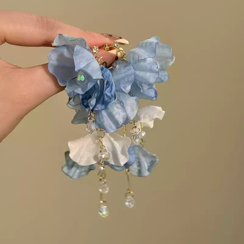 玫瑰冰茶~蓝色流苏花朵耳钉女高级感度假风小众耳环绝美耳饰耳夹