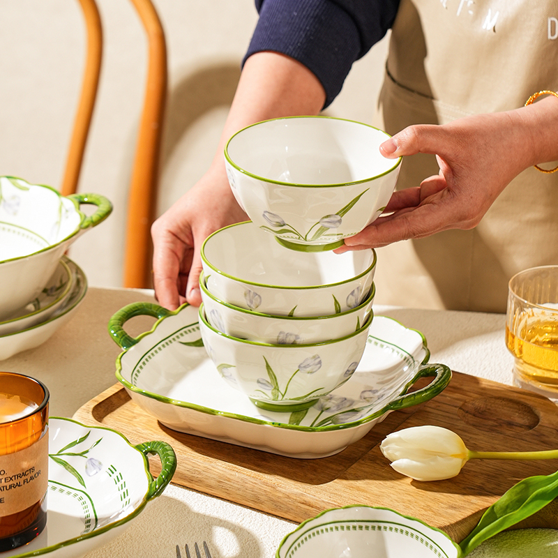 奶油风陶瓷碗家用卡通菜盘子可爱米饭碗汤碗釉下彩儿童餐具耐高温