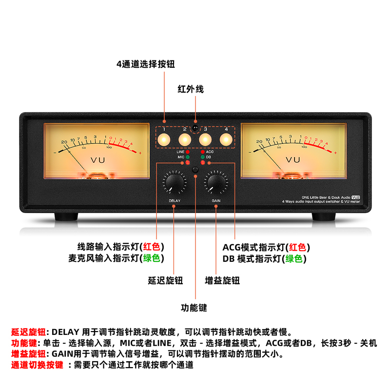 VU2音乐电平表声控模拟VU表 4进1出4路音频切换器RCA分配器带遥控
