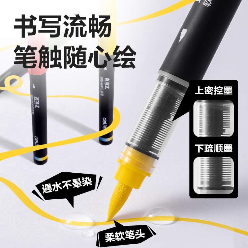 得力小黑盒直液式丙烯马克笔软头大容量强覆盖力不易透纸可叠色小学生美术绘画涂鸦DIY适用