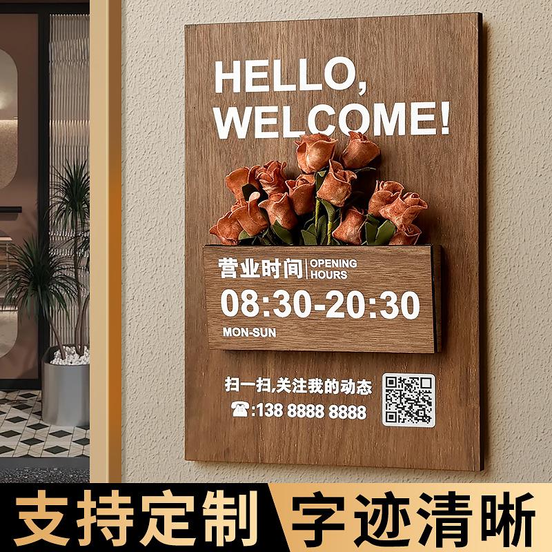 木质营业时间告示牌工作室服装店门口广告标识牌定制插花装饰玻璃贴纸美甲美容店营业中上下班工作时间提示牌