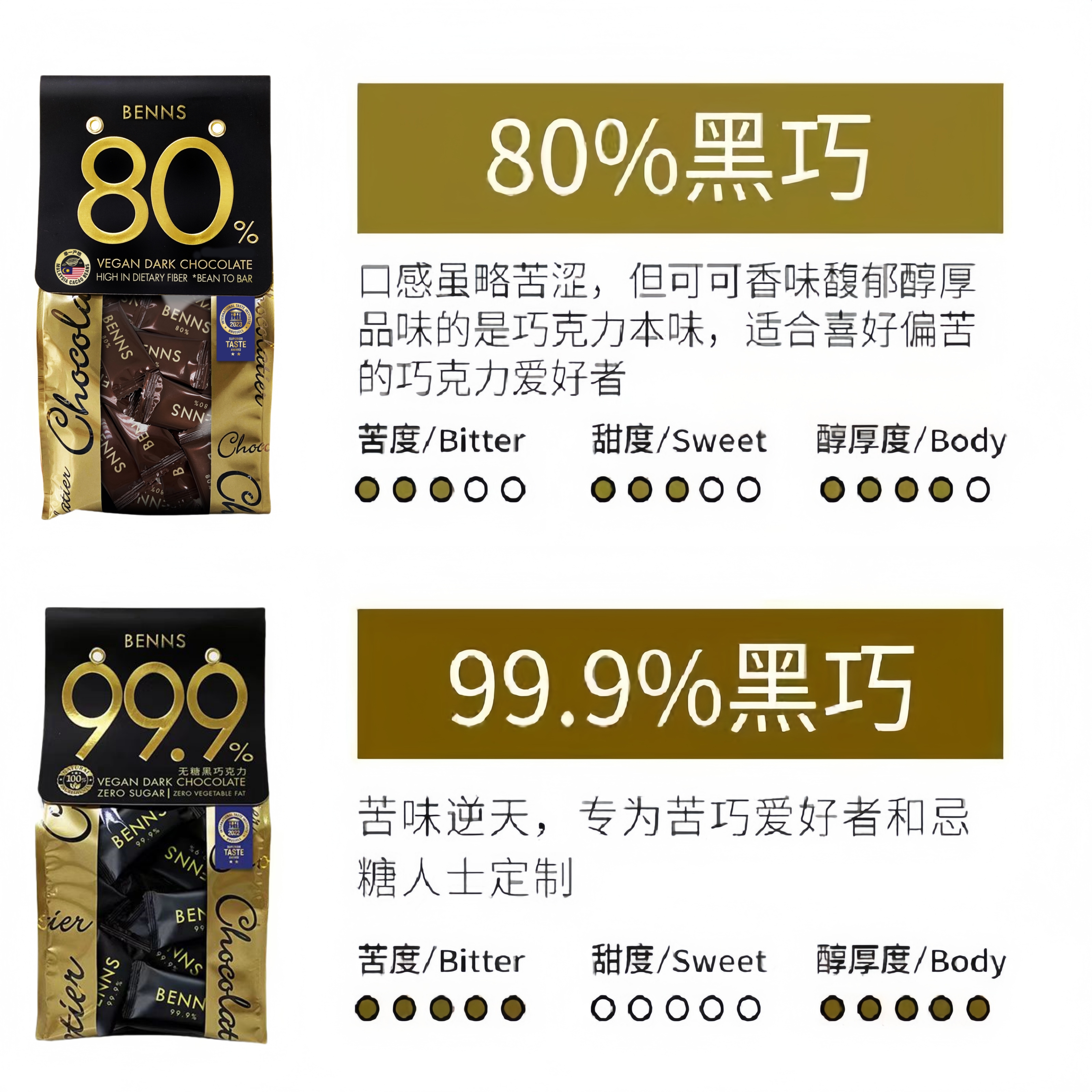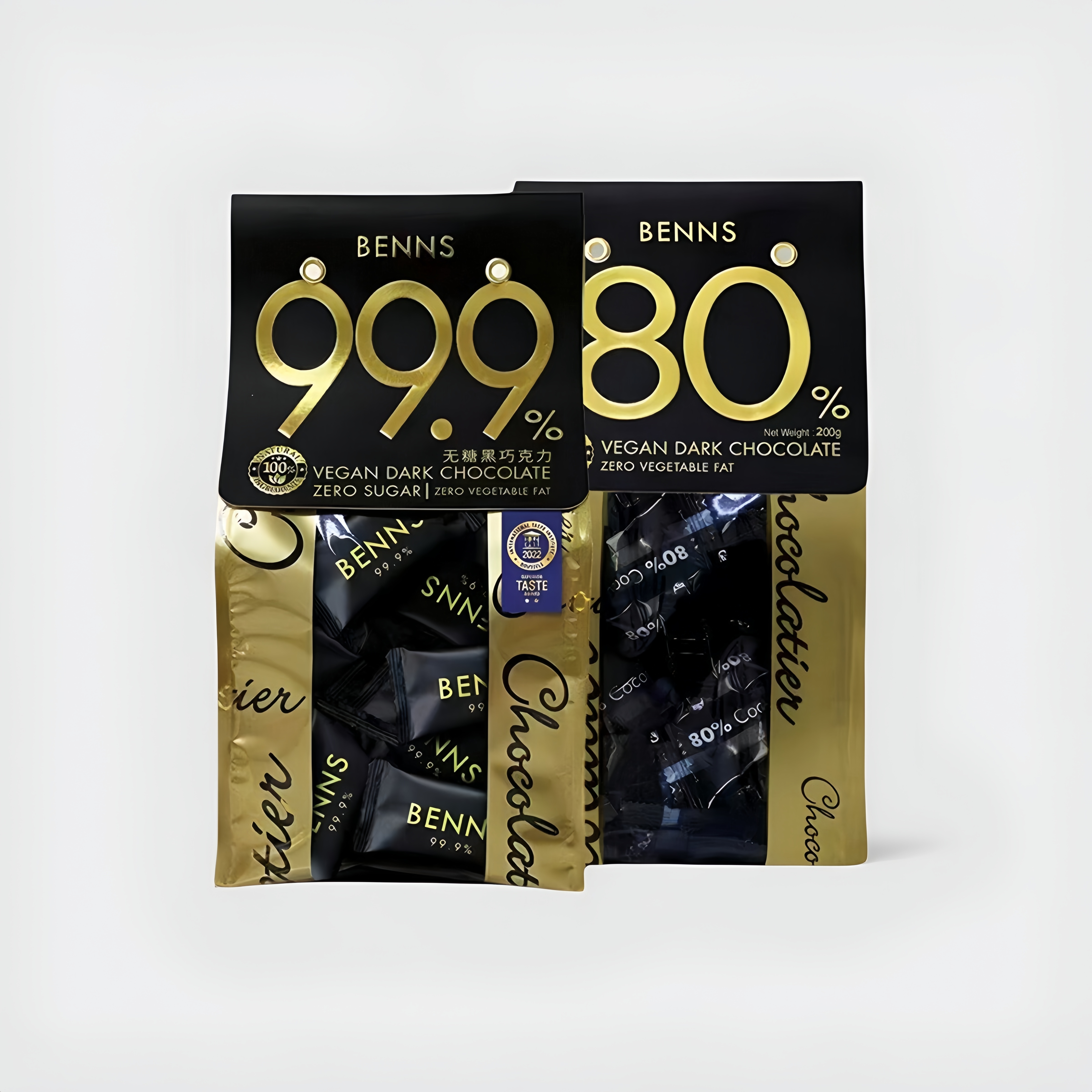 BENNS贝纳丝无糖进口黑巧克力99%纯可可脂零食健身80%袋装新品