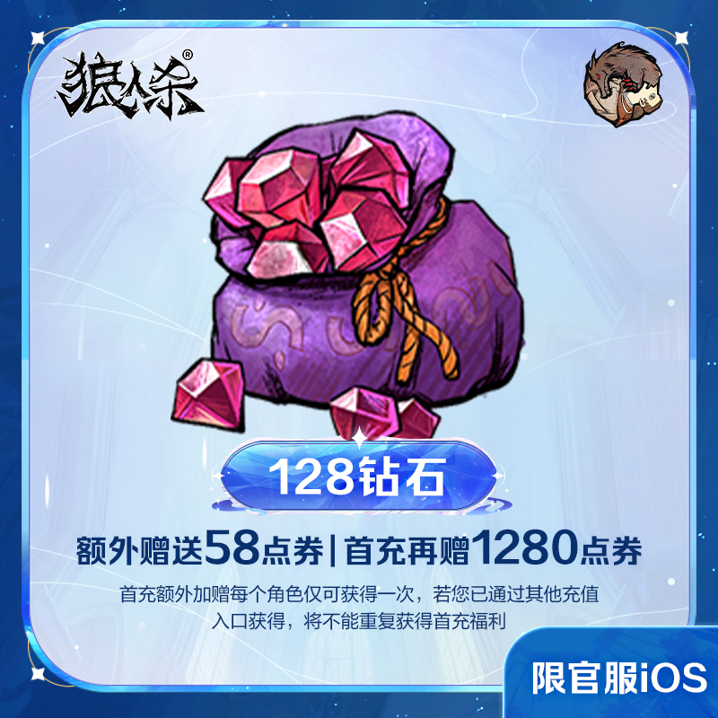 128钻石 点券加赠 iOS专属 计入累充 【狼人杀】 网易官方直充