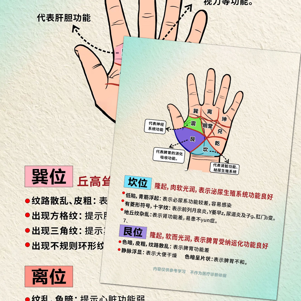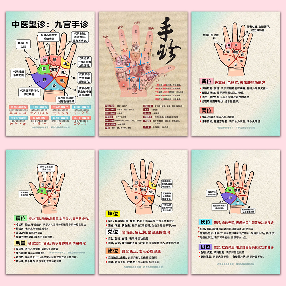 中医望闻问切九宫手诊】手部经络反射图像基础笔记手绘图解贴画