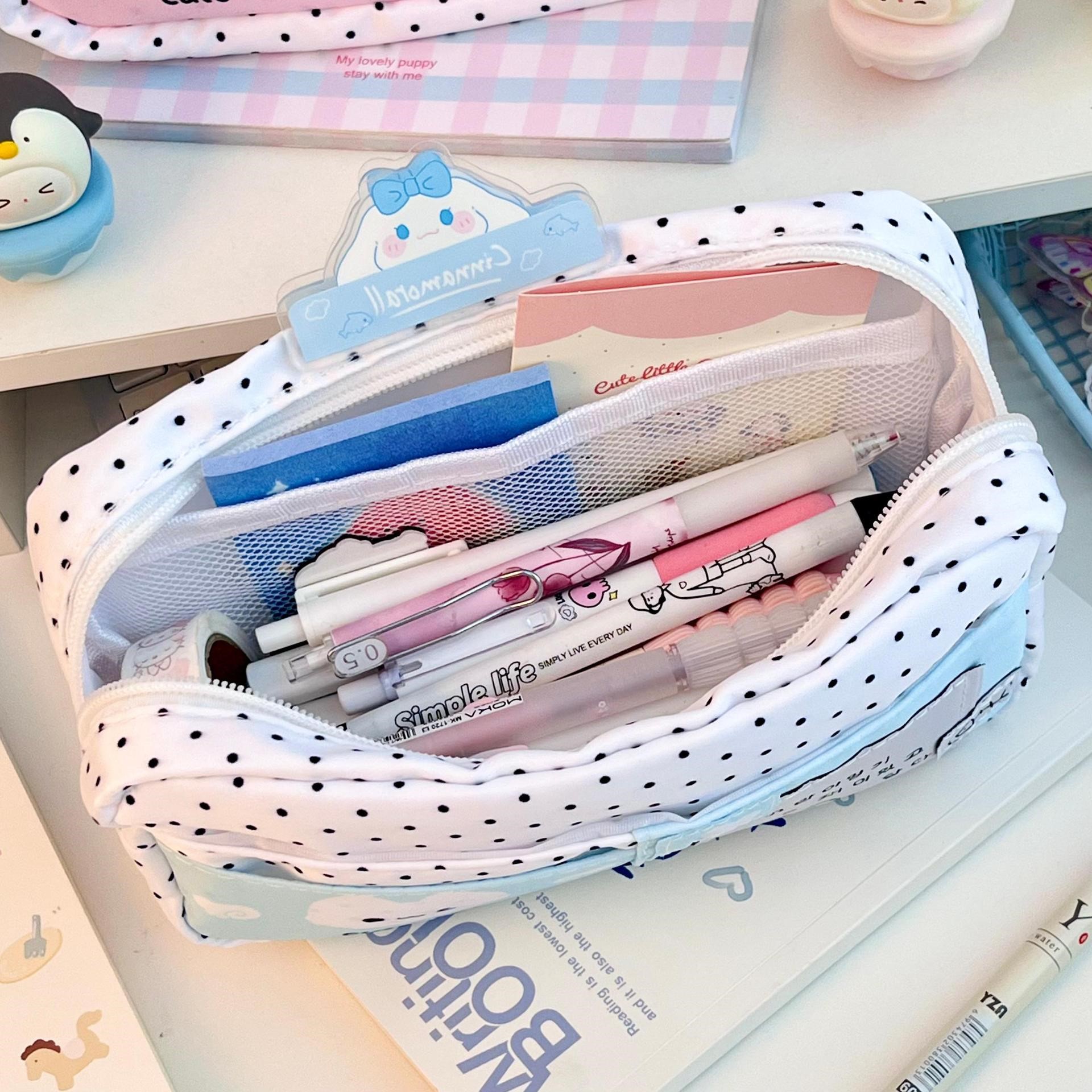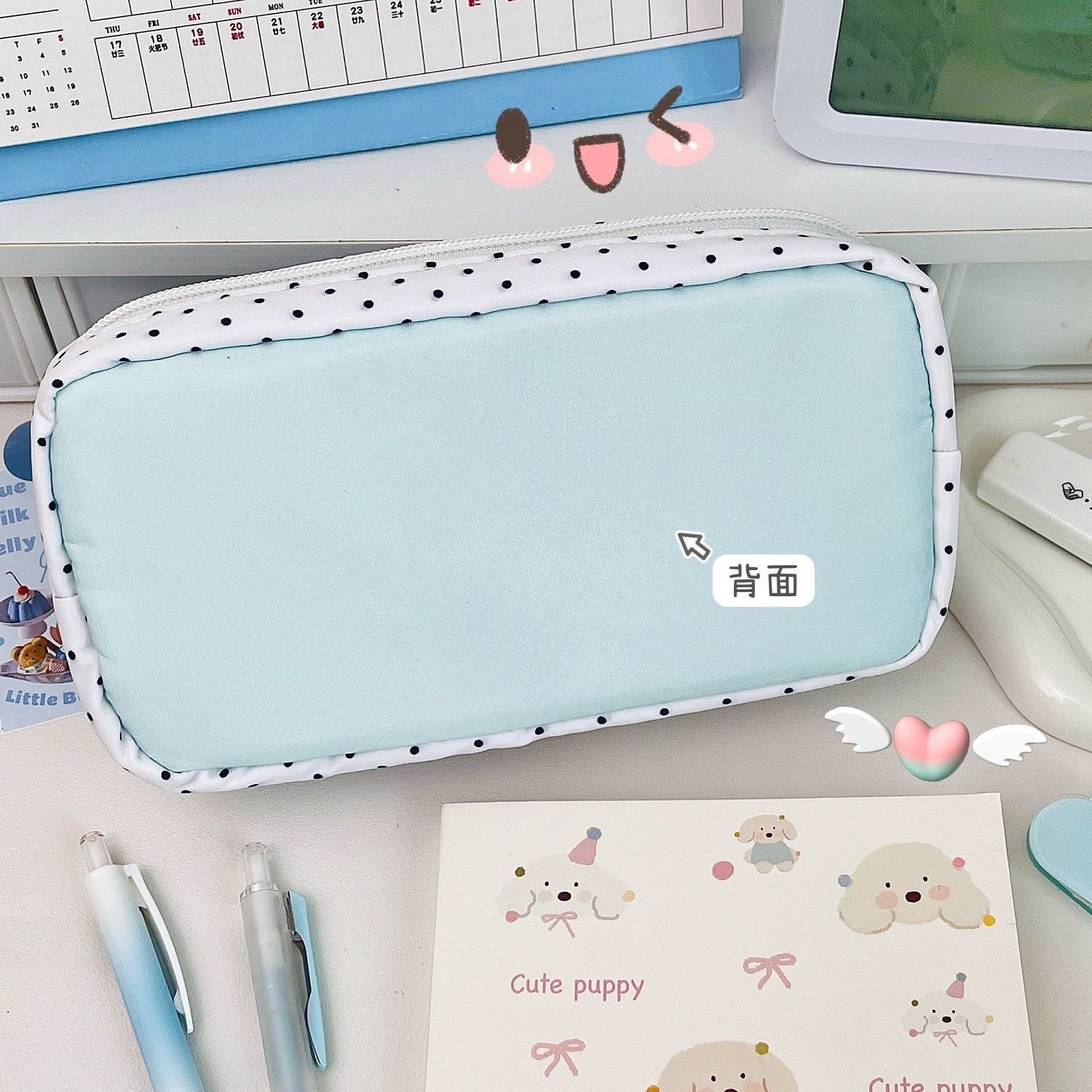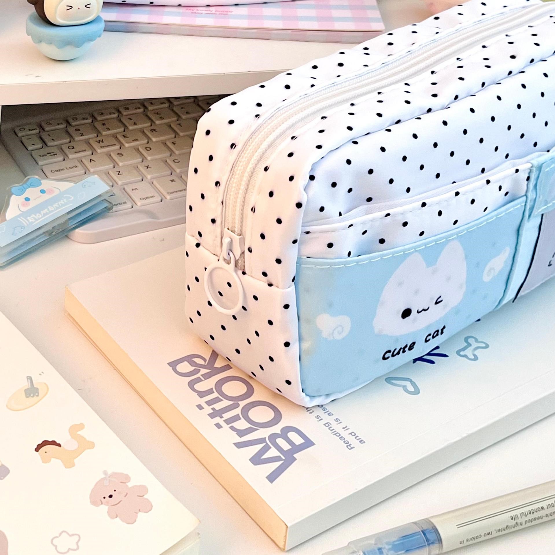 原创薄荷蓝波点小猫多层痛包笔袋高颜值ins学生大容量铅笔文具袋