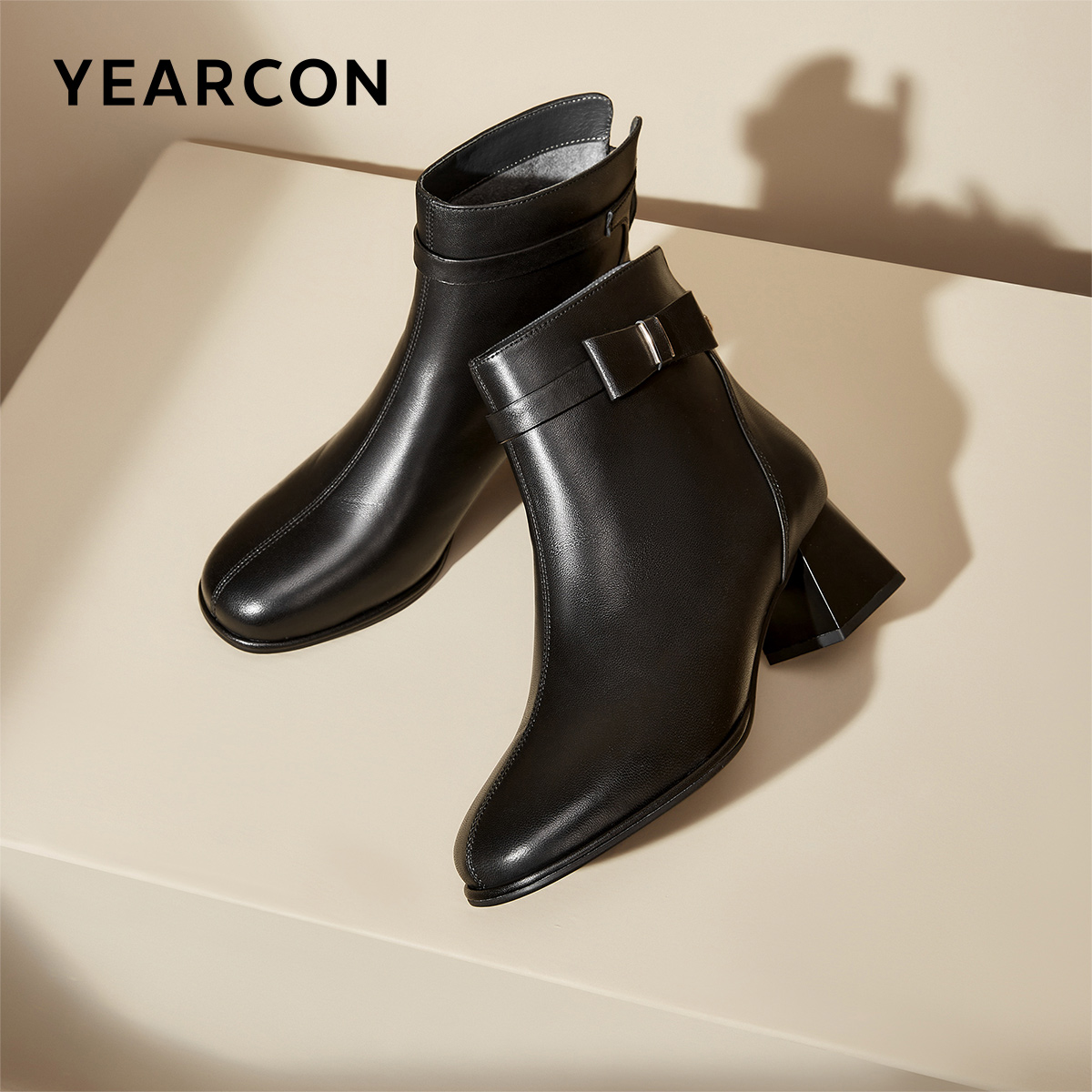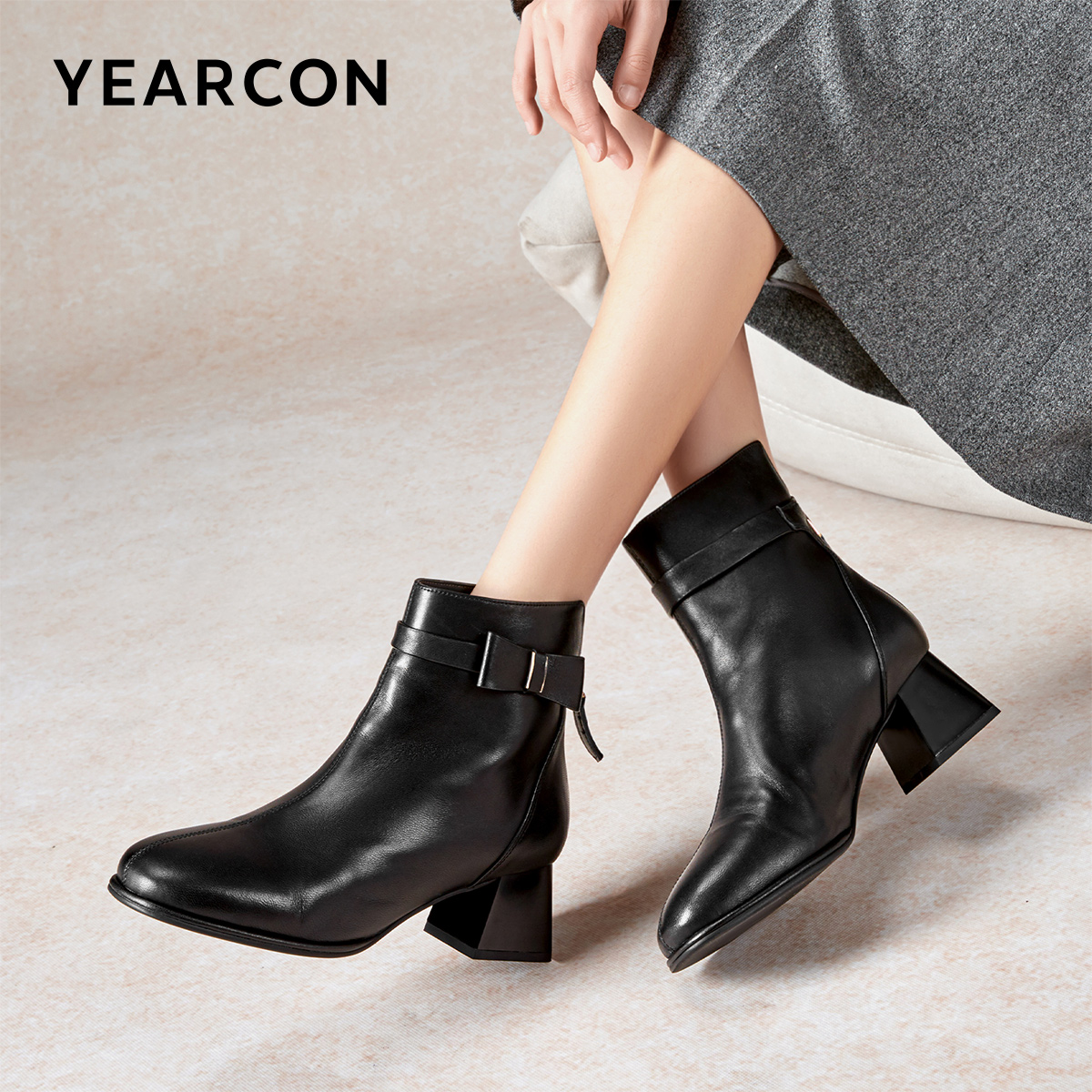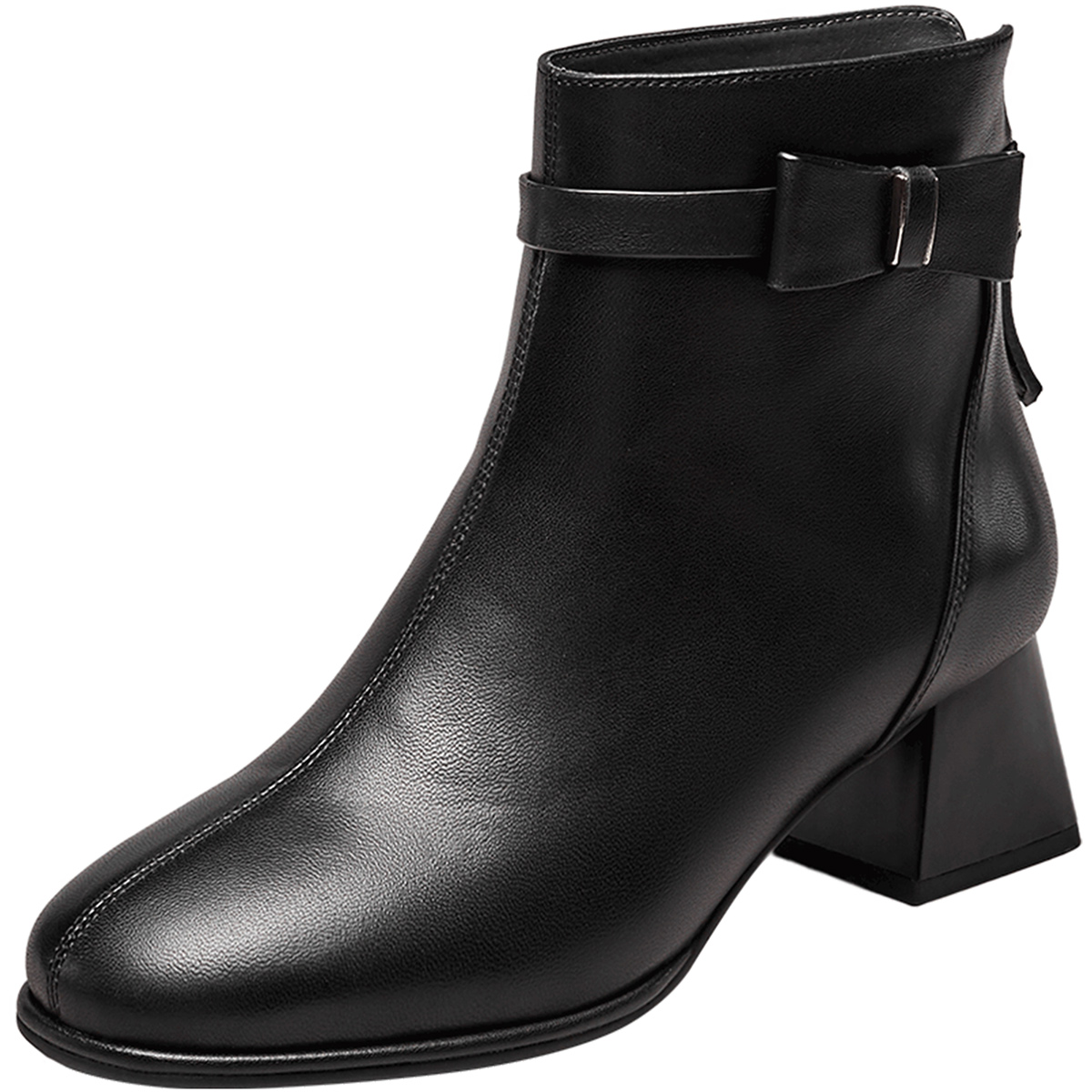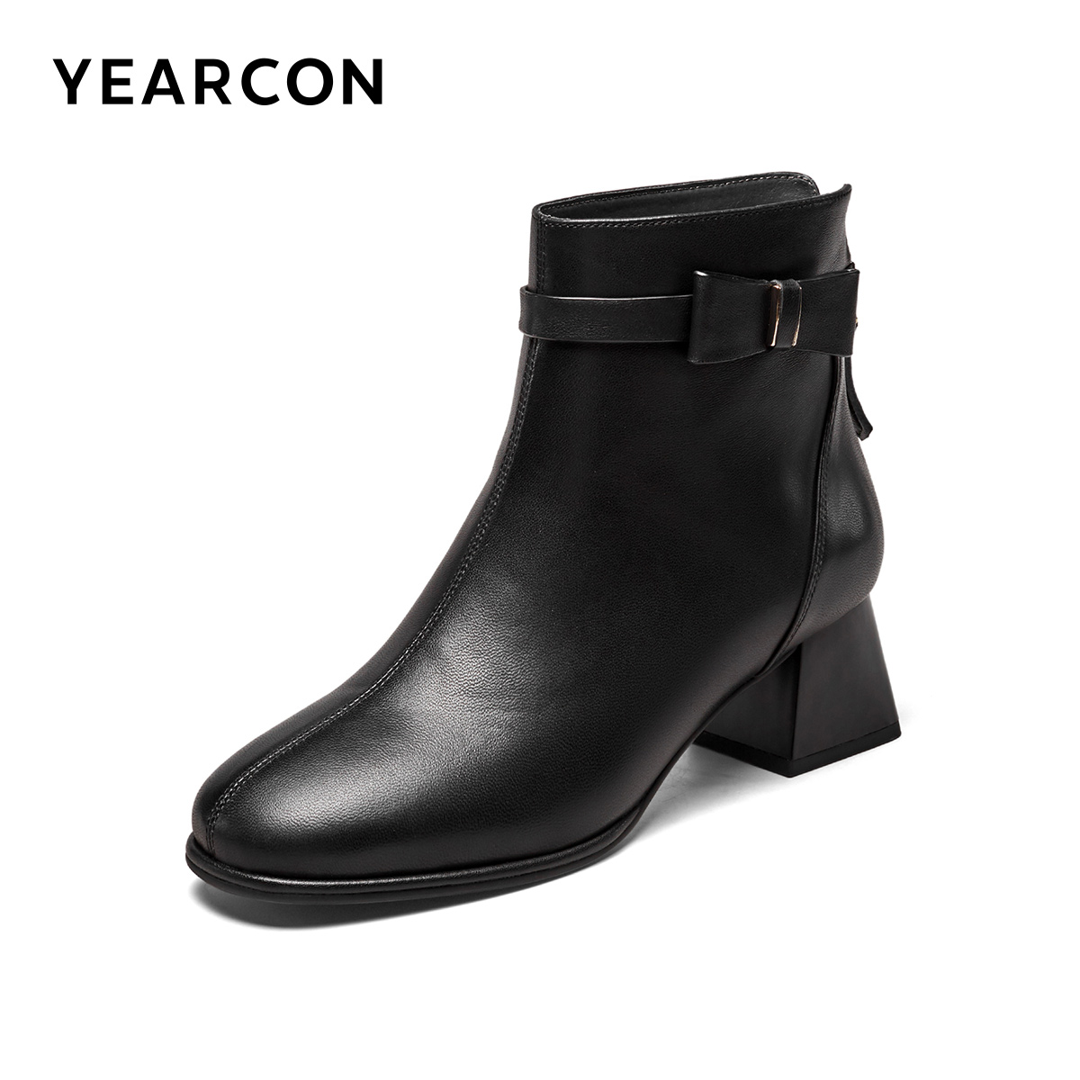 意尔康女鞋秋冬羊皮短靴粗跟单靴气质英伦显瘦真皮及踝靴女士皮鞋